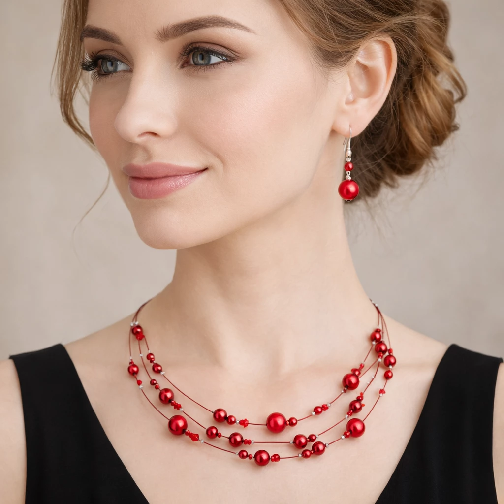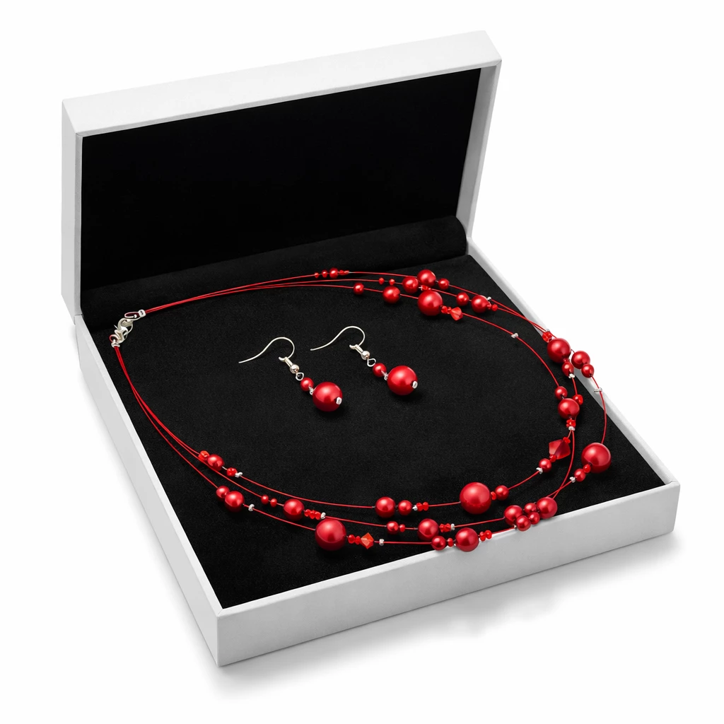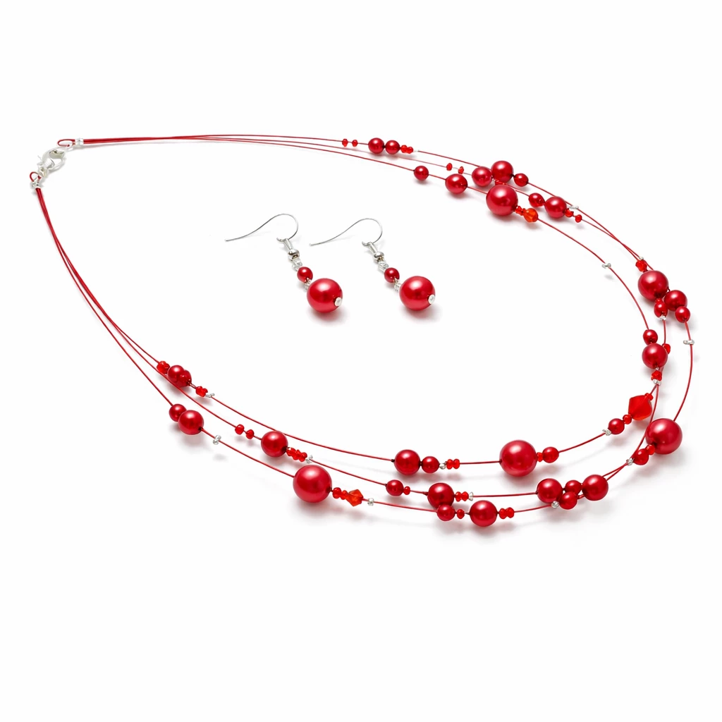 Elegantní souprava náhrdelníku a náušnic v barvě červené zaujme svou lehkostí a jemným třpytem. Kombinace různě velkých korálků vytváří vzdušný design, který krásně doplní jak každodenní outfit, tak i slavnostnější příležitosti.
