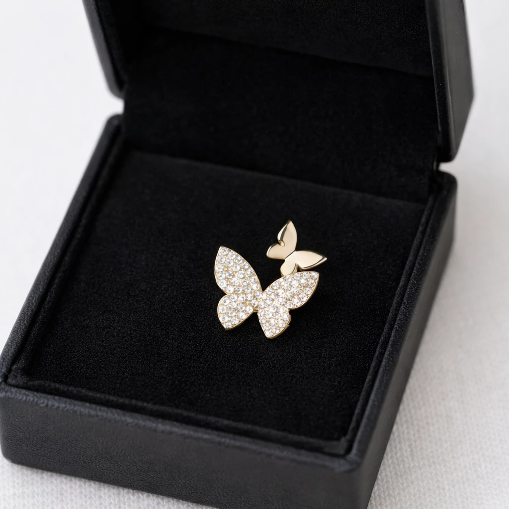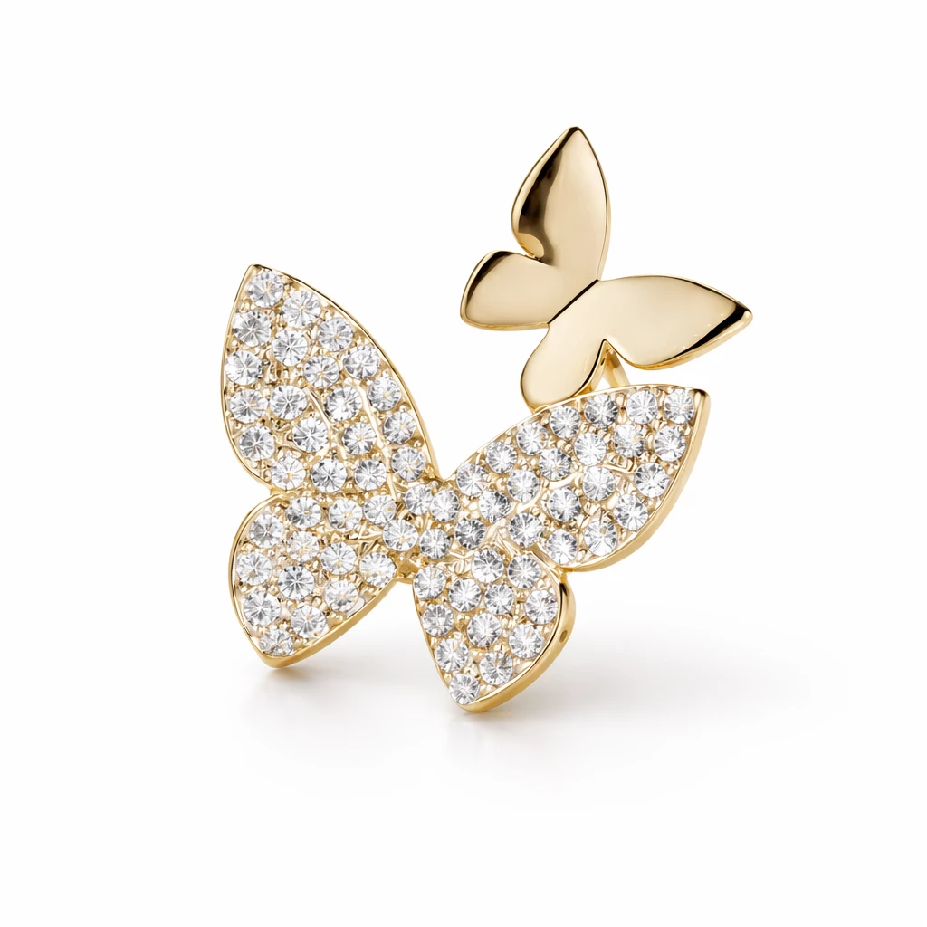 Brož Motýlek je něžný doplněk s precizně osazenými štrasovými kamínky, které dodávají šperku jemný třpyt. Kombinace hladkého kovu a třpytivé spodní části působí elegantně a nadčasově.