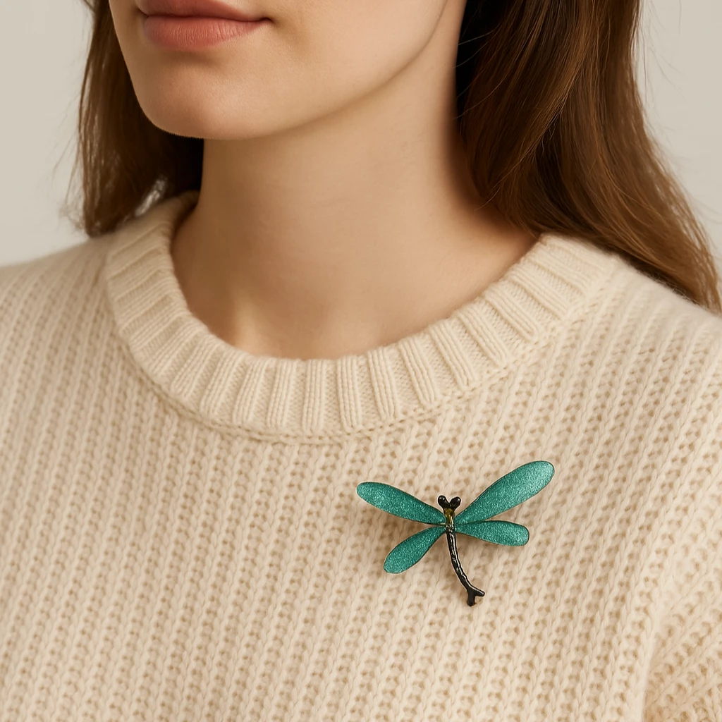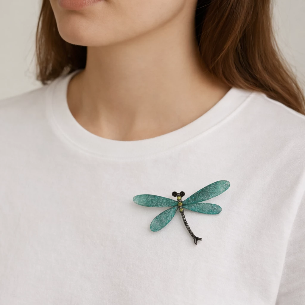 Tyrkysová brož ve tvaru vážky je rychlý způsob, jak dodat outfitu šmrnc – krásně vynikne na svetru, saku i kabátu. Jemně třpytivý vzhled křídel působí elegantně a originálně.