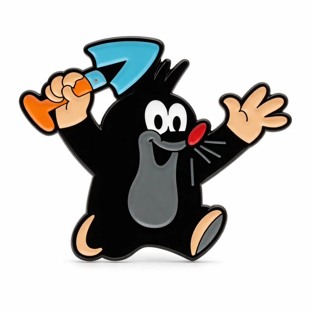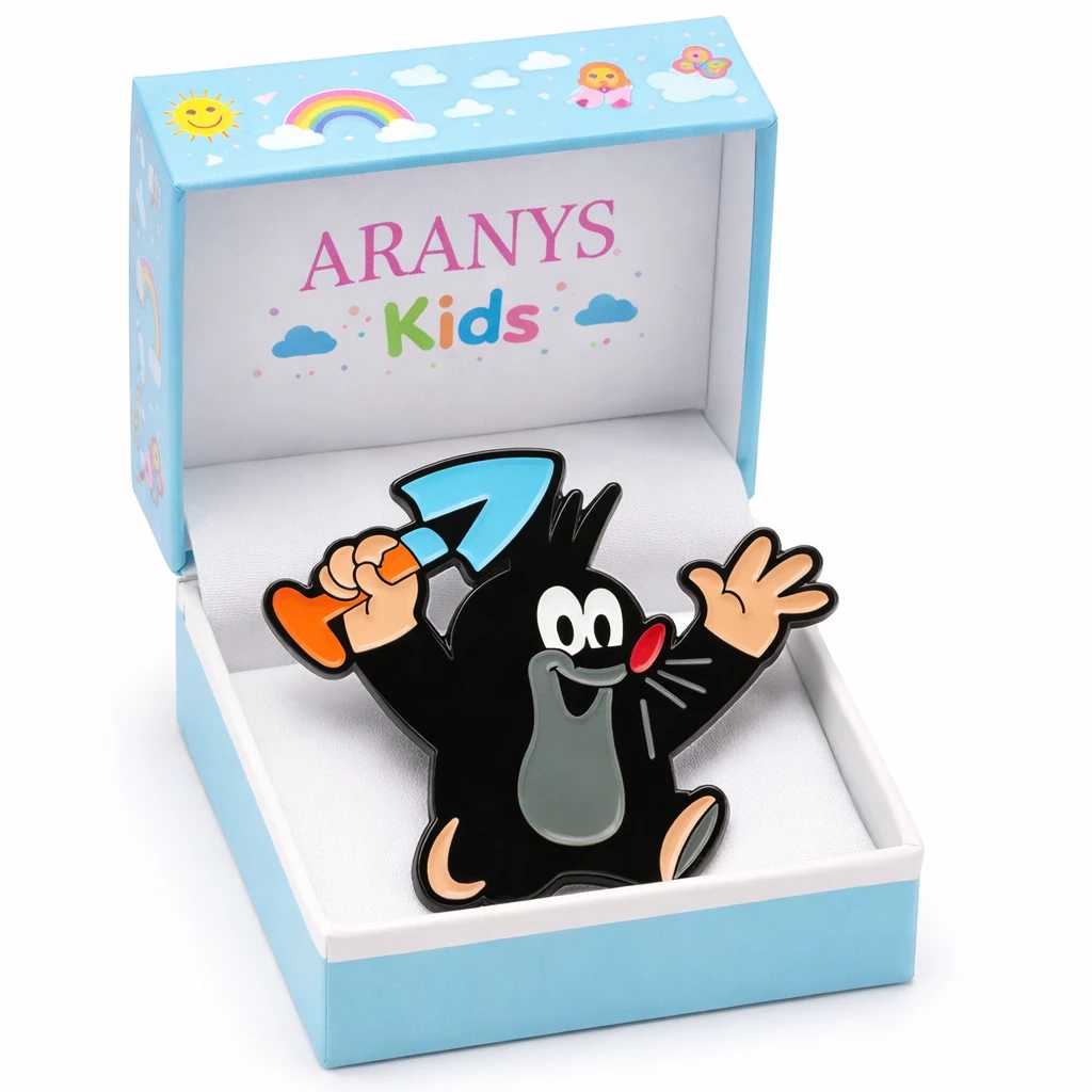 Dětská bižuterní brož Krteček s lopatkou přináší hravý motiv oblíbené postavičky, který okamžitě rozzáří každý dětský outfit.