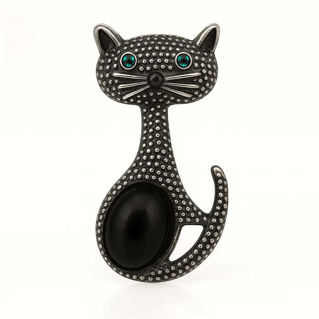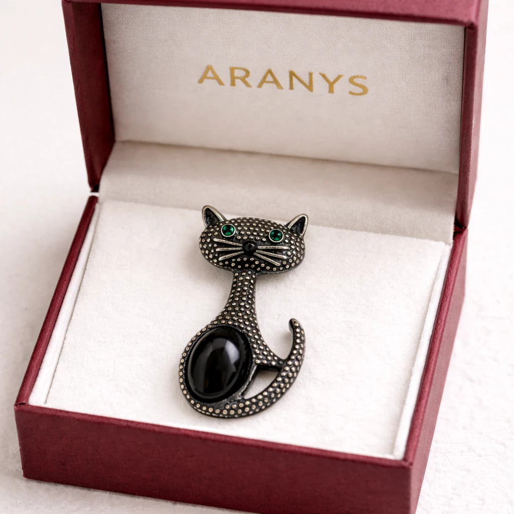 Tato brož ve tvaru kočky zaujme na první pohled svým propracovaným designem a jemnou strukturou povrchu. Dominantním prvkem je hladký černý kámen, který kontrastuje se zelenými kamínky v očích a dodává broži výraz i hloubku.