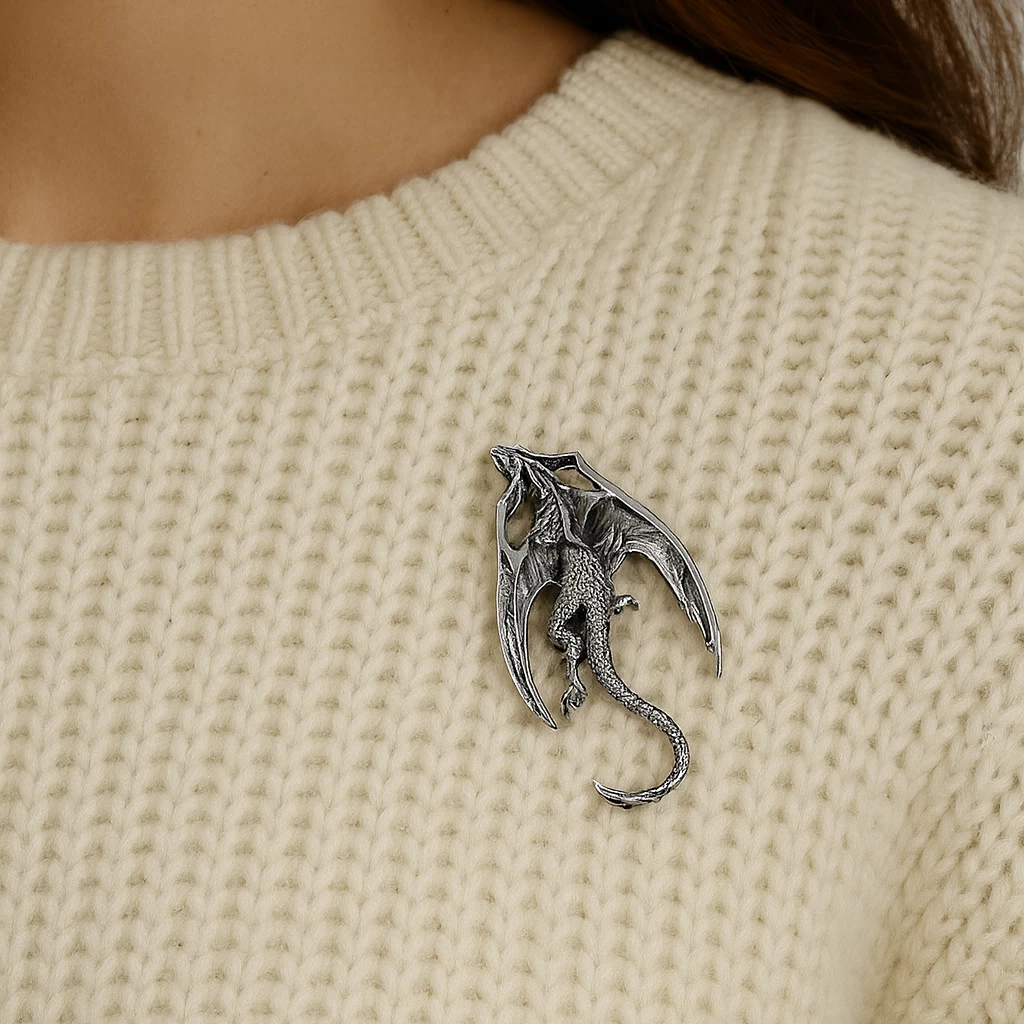 Skvěle se hodí jako dominantní prvek na svetr, kabát, pončo, šálu nebo klopu saka. Udělá radost také jako originální dárek – ať už pro fanoušky draků, fantasy světa, nebo jen pro ty, kteří chtějí outfit ozvláštnit jedním silným šperkovým prvkem.