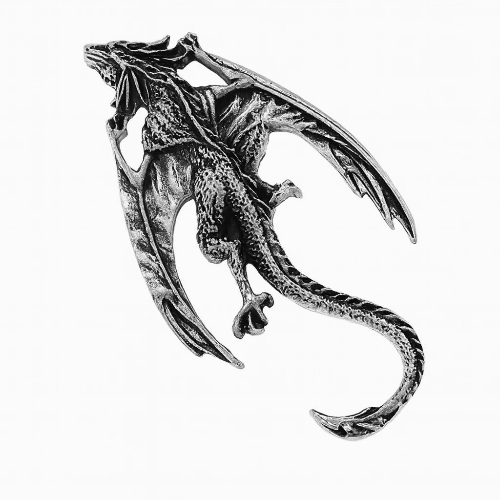 Výrazná bižuterní brož ve tvaru draka ve stříbrném antik efektu, která okamžitě přitáhne pozornost. Skvěle vynikne na svetru, kabátu, šále i klopě saka a dodá outfitu fantasy/gothic nádech.