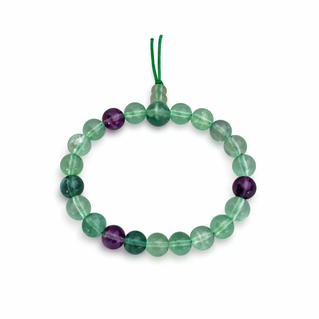 Buddhův energetický náramek fluorit Soustředění se skládá z 21 menších kuliček a mistrovského kamene (jedné větší, též nazýváno Guru). Kamenné kuličky jsou navlečeny na šperkařské gumičce. Navazuje na buddhistické tradice modlitebních korálků k meditaci.