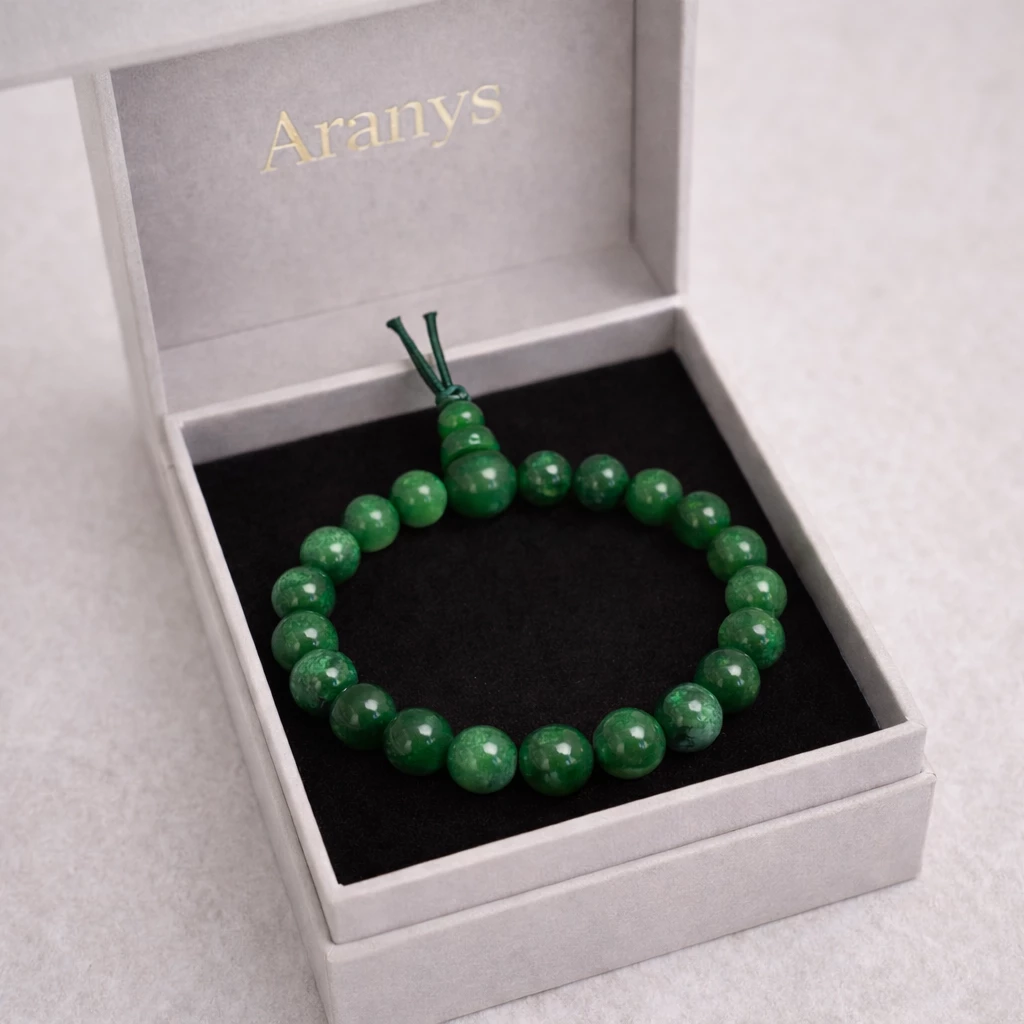 Buddhův energetický náramek nefrit Prosperita je tvořen z přírodního nefritu – kamene, který je tradičně spojován s prosperitou, ochranou a moudrým klidem. Je ideální jako každodenní talisman, který podporuje stabilitu, trpělivost a harmonické rozhodování.