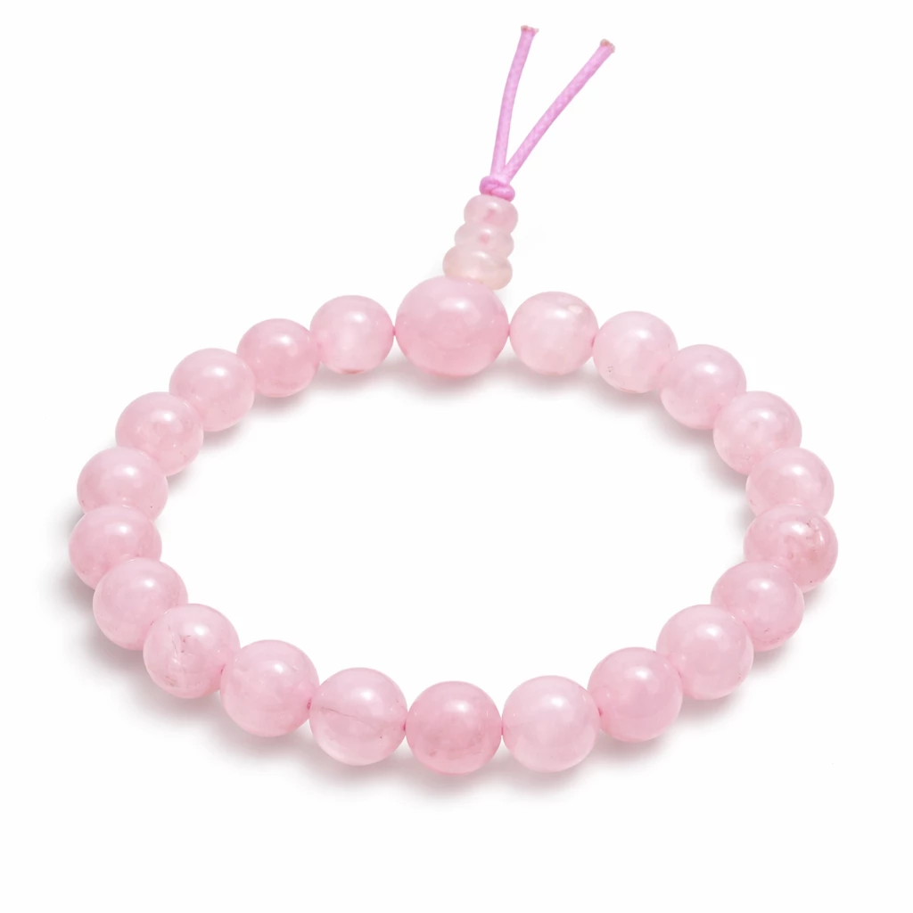 Kuličky romantického růženínu v buddhově energetického náramku.