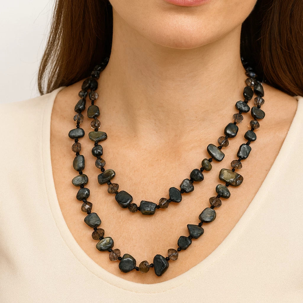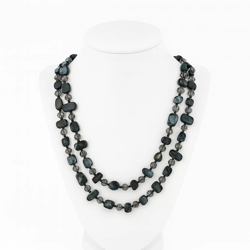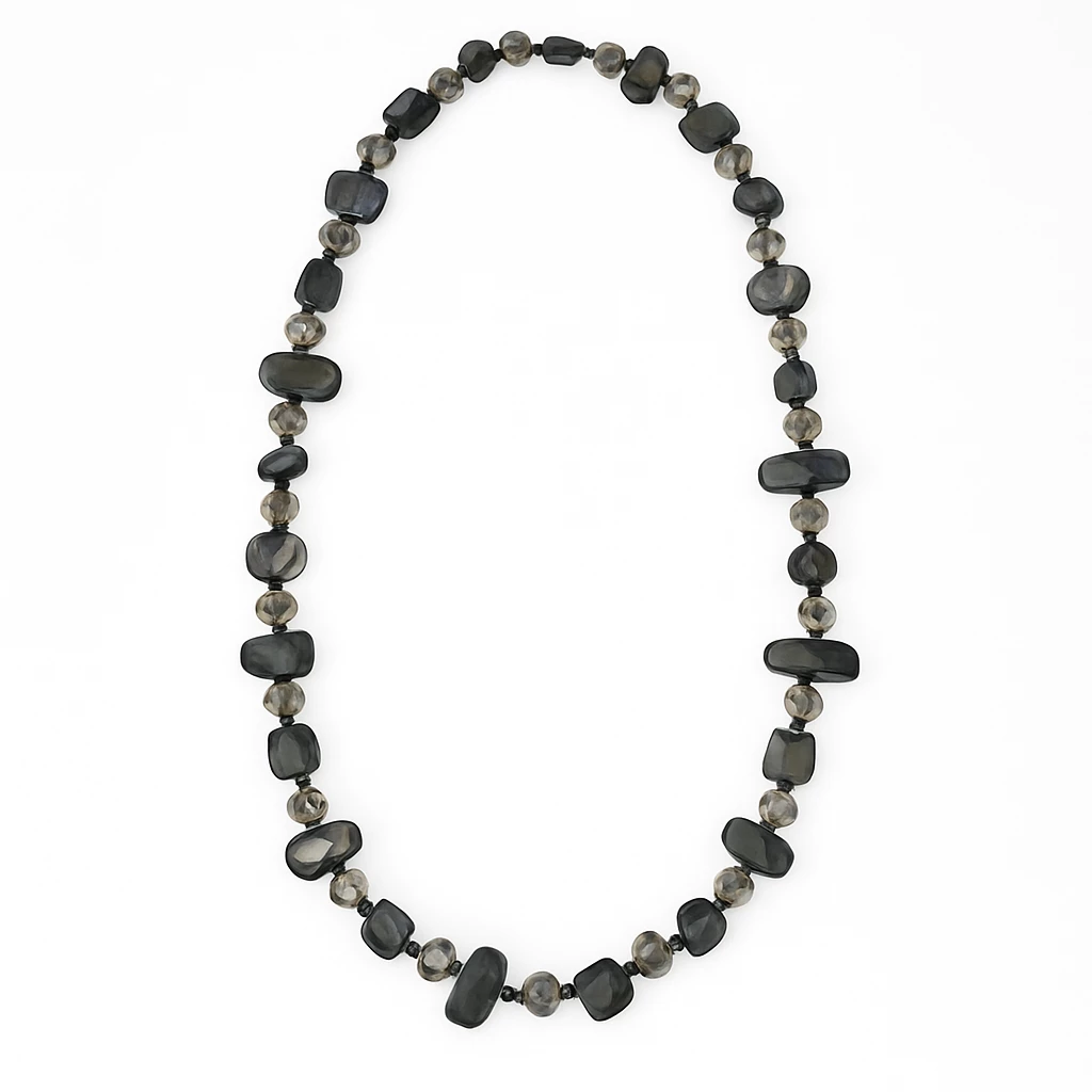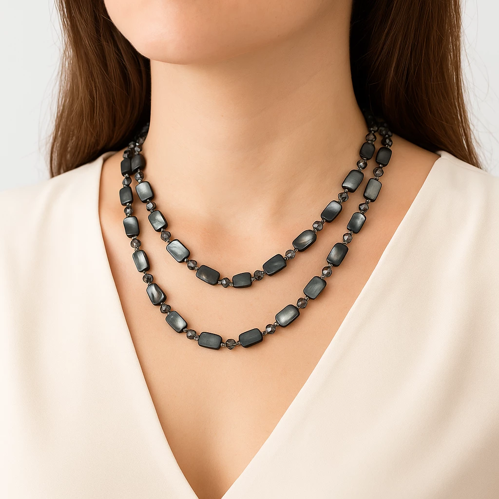 Ručně vyrobený šperk z nádherné tradiční jablonecké bižuterie se stane skvostným a originálním doplňkem pro každou ženu. Náhrdelník je tvořen širším obojkem kolem krku z broušených černých korálků. Tento obojek je dozdoben delšími šňůrami navlečených korálků v různých délkách. Zapínání je na karabinku a díky prodlužovacímu řetízku si můžete zvolit velikost, jaká bude pro Vás právě nejvhodnější.