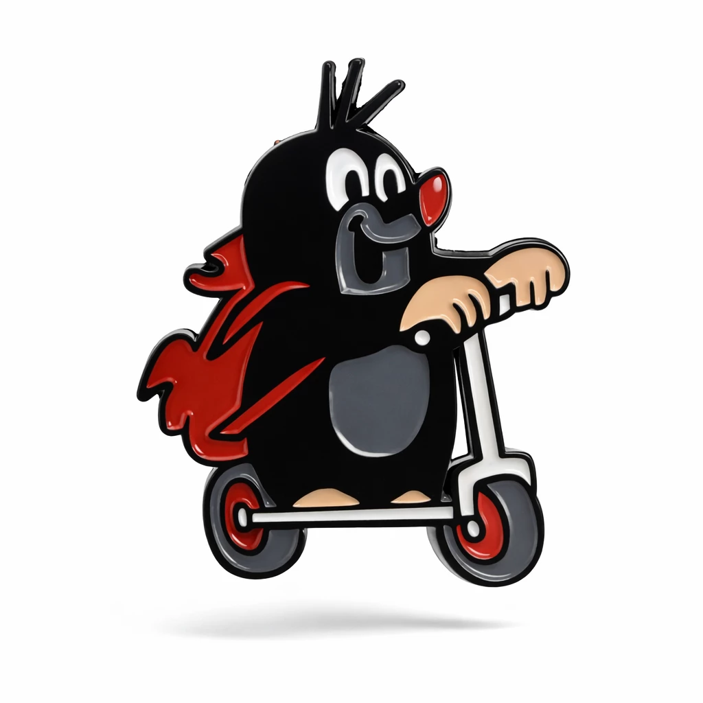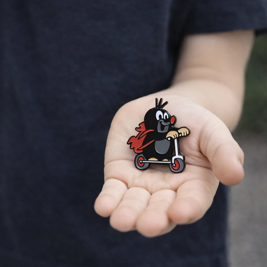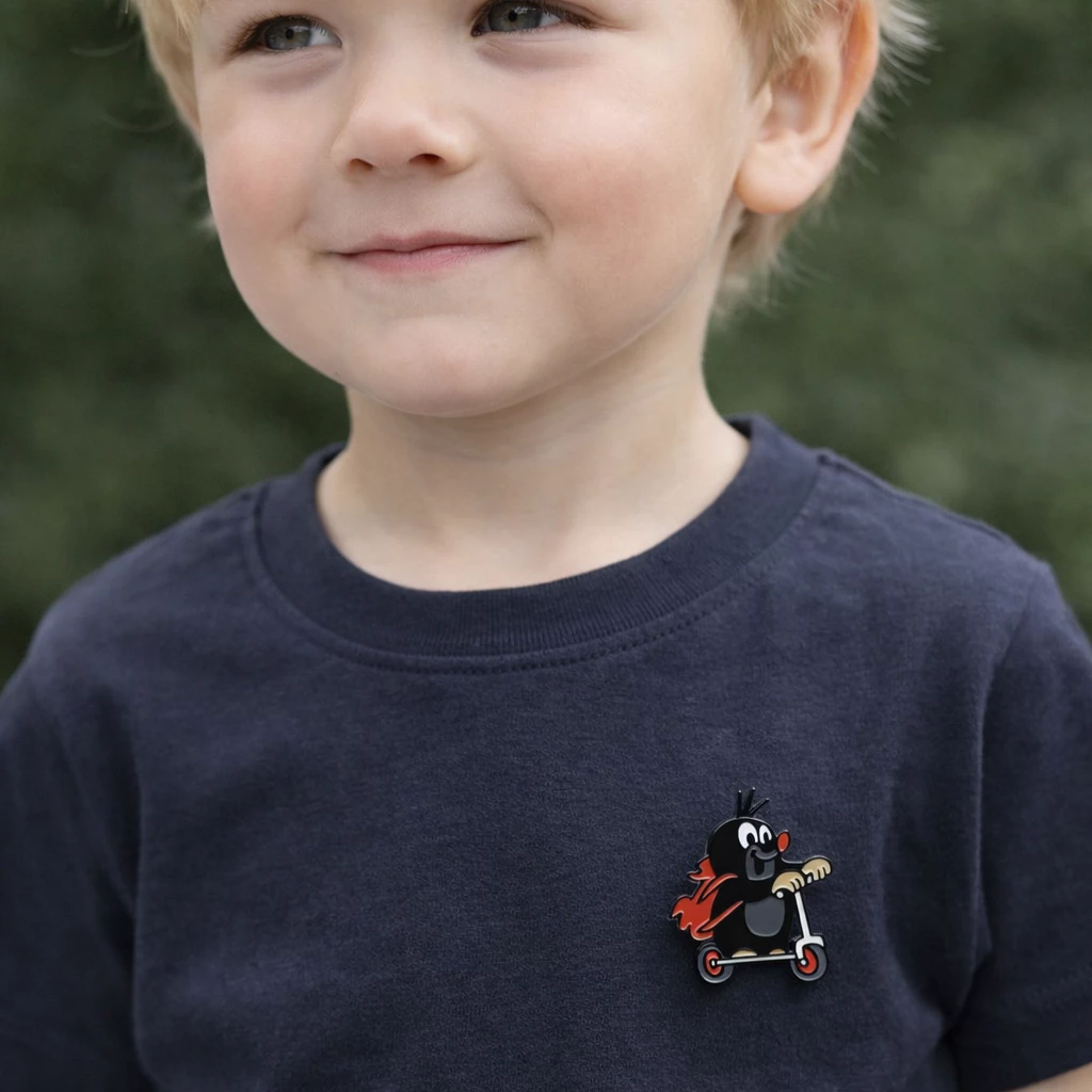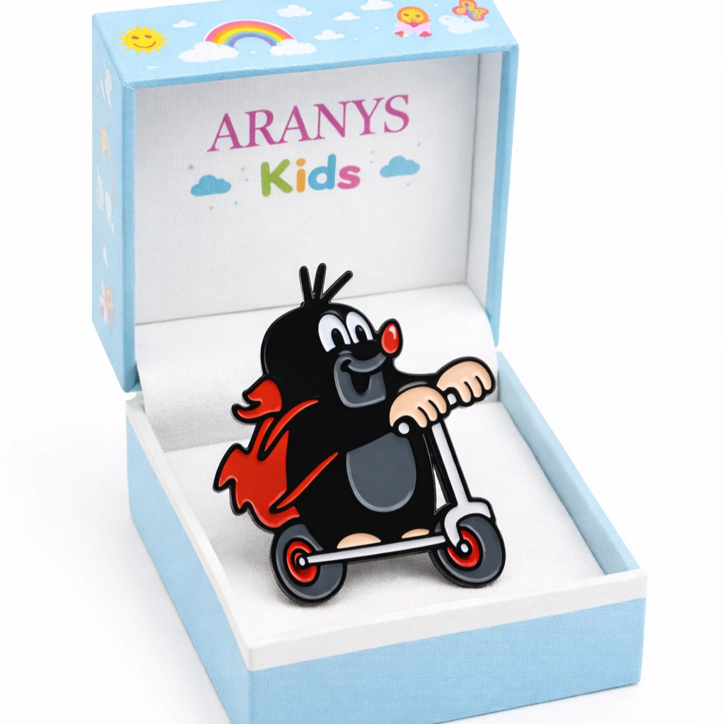 Dětská bižuterní brož Krteček na koloběžce přináší hravý motiv oblíbené postavičky, který okamžitě rozzáří každý dětský outfit.