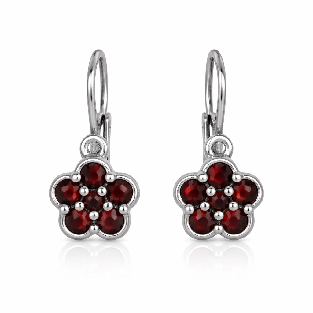 Jemné stříbrné náušnice Serafina s českým granátem ve tvaru květu zaujmou svou romantickou elegancí a precizním zpracováním. Sytě červené kameny vytvářejí harmonický celek, který krásně rozzáří každý outfit.