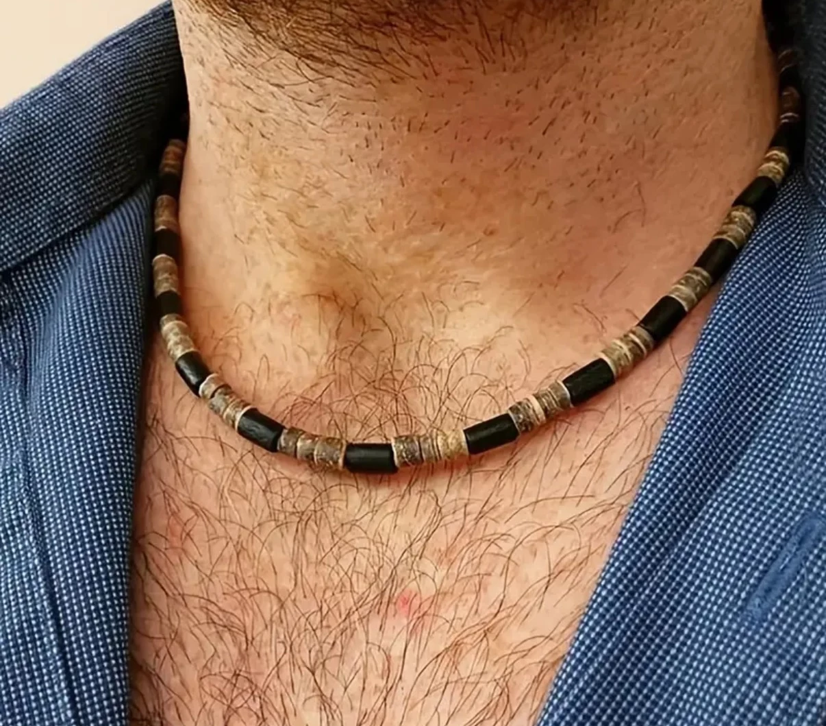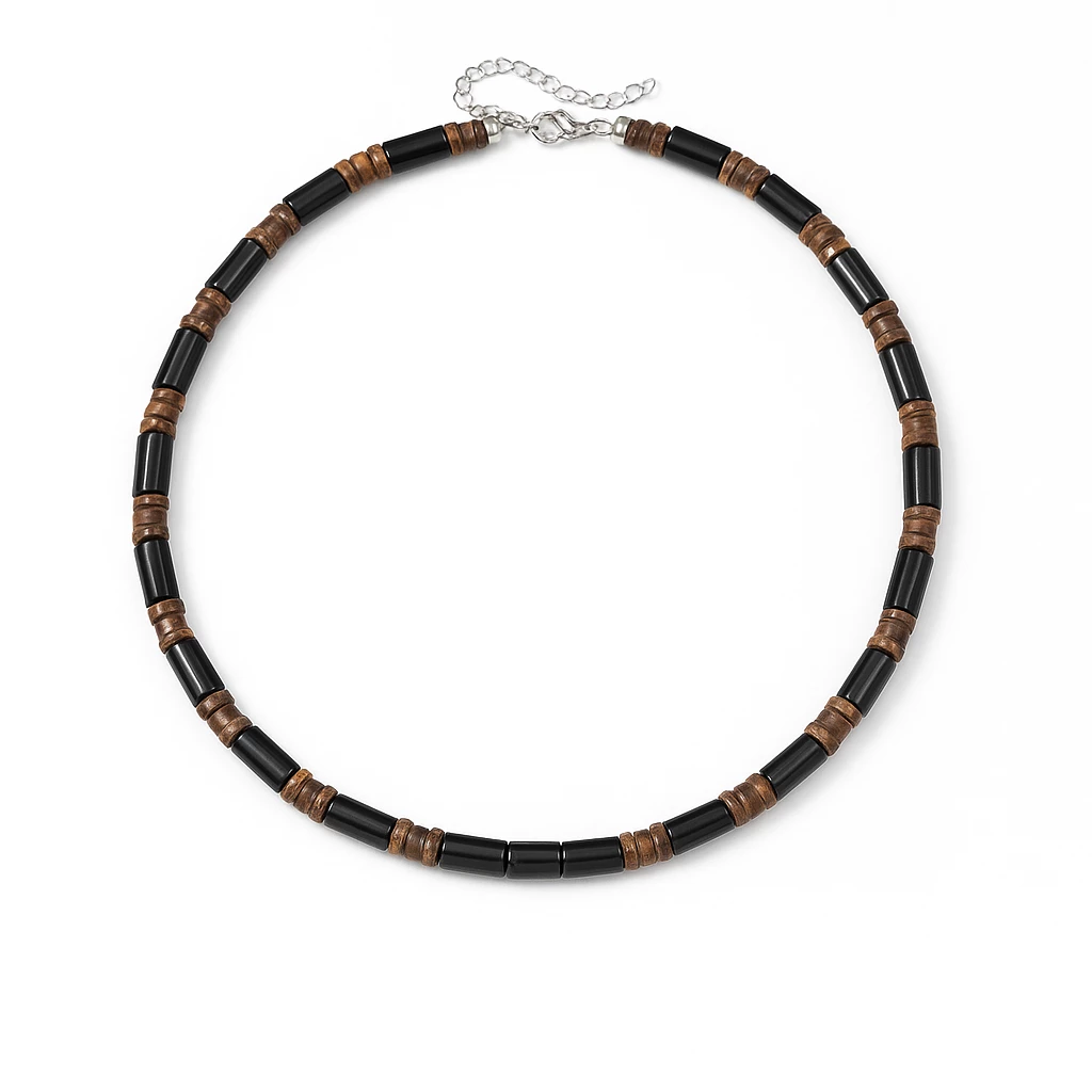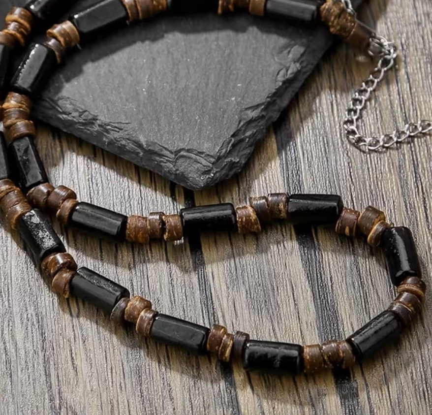 Půvabná pánská dřevěná souprava, která je složená z náhrdelníku a náramku, je přesně pro ty, co mají rádi dřevěné šperk.