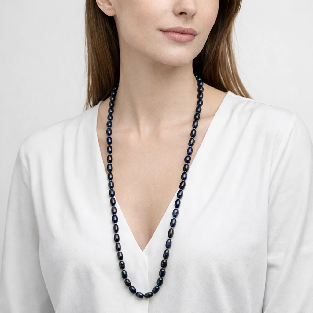 Náhrdelník z oválných tmavých říčních perel Josephine Long je vyroben z pravých tmavých říčních perel v hlubokých odstínech s jemným kovovým leskem. Díky délce přibližně 120 cm se pohodlně navléká přes hlavu a umožňuje variabilní styling.