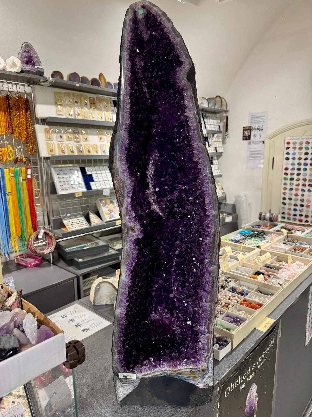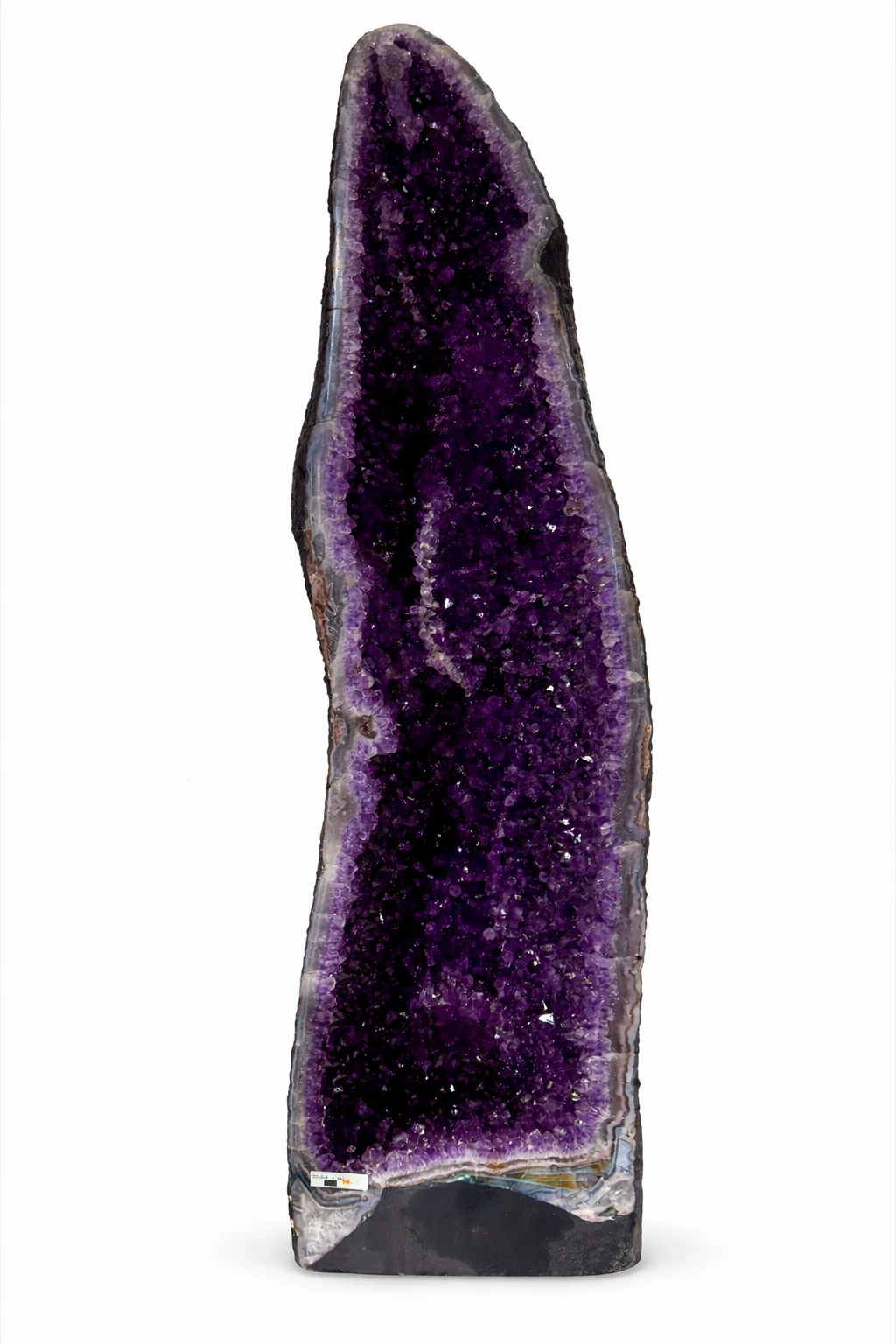 Vnitřek geody je bohatě vyplněn hustě narostlými ametystovými krystaly s přirozeným leskem, které vytvářejí jedinečný vizuální efekt a pocit hloubky. Přechody barevných tónů od světlých až po temně fialové odstíny podtrhují výjimečnou kvalitu tohoto kusu a činí z něj nejen dekorativní dominantu, ale také vysoce sběratelsky a investičně atraktivní objekt.