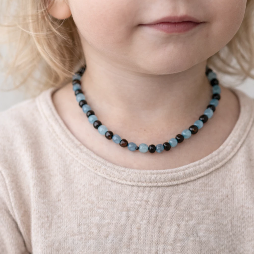 Krásné jantarové korálky pro děti i dospělé. Jantar je velkým pomocníkem proti bolesti zubů a akvamarín chrání před stresem.