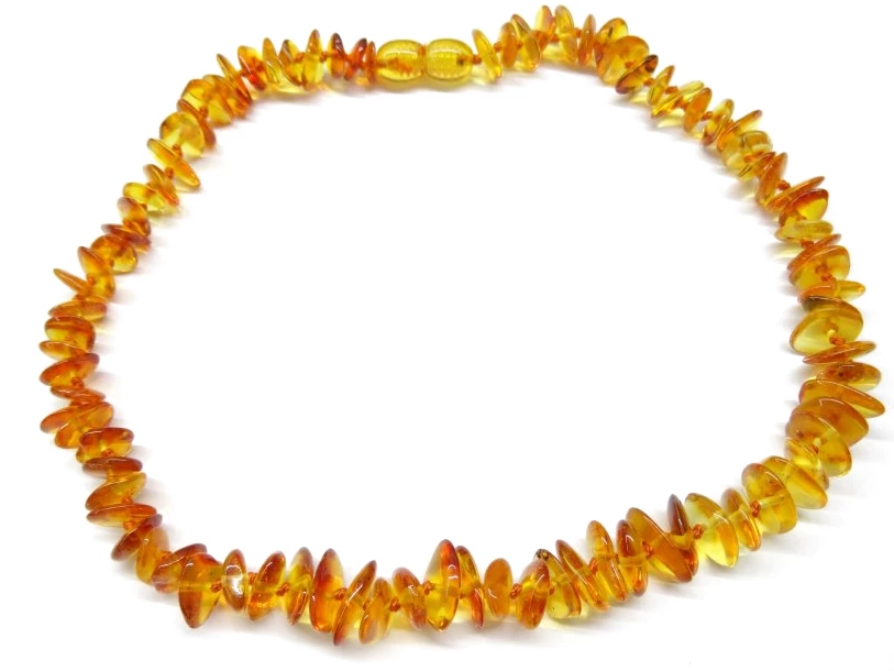 Jantarové korálky jsou vyrobeny z přírodního sekaného jantaru, ohlazeného a vyleštěného pro větší bezpečnost a lesk. Korálky jsou mezi sebou zajištěny uzlíky, aby se při případném přetržení nevysypaly, a jsou navlečené na šňůrce ze 100% hedvábí. Největšími přednostmi hedvábí je jeho lehkost, pevnost a lesk. Je také vhodné pro alergiky. Jednotlivé kousky jsou opatřeny bezpečnostním šroubovacím pojistným uzávěrem z polyresinu (bez obsahu niklu).