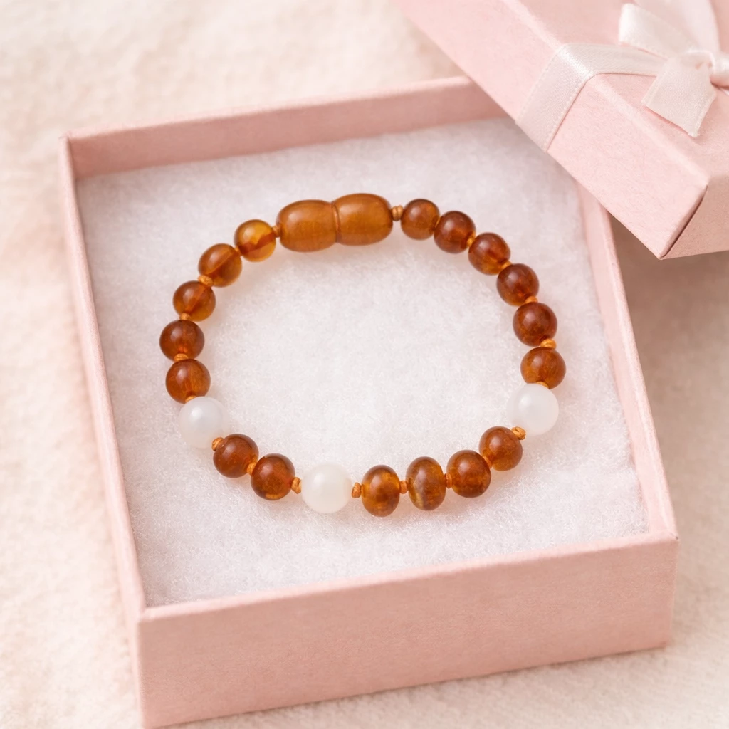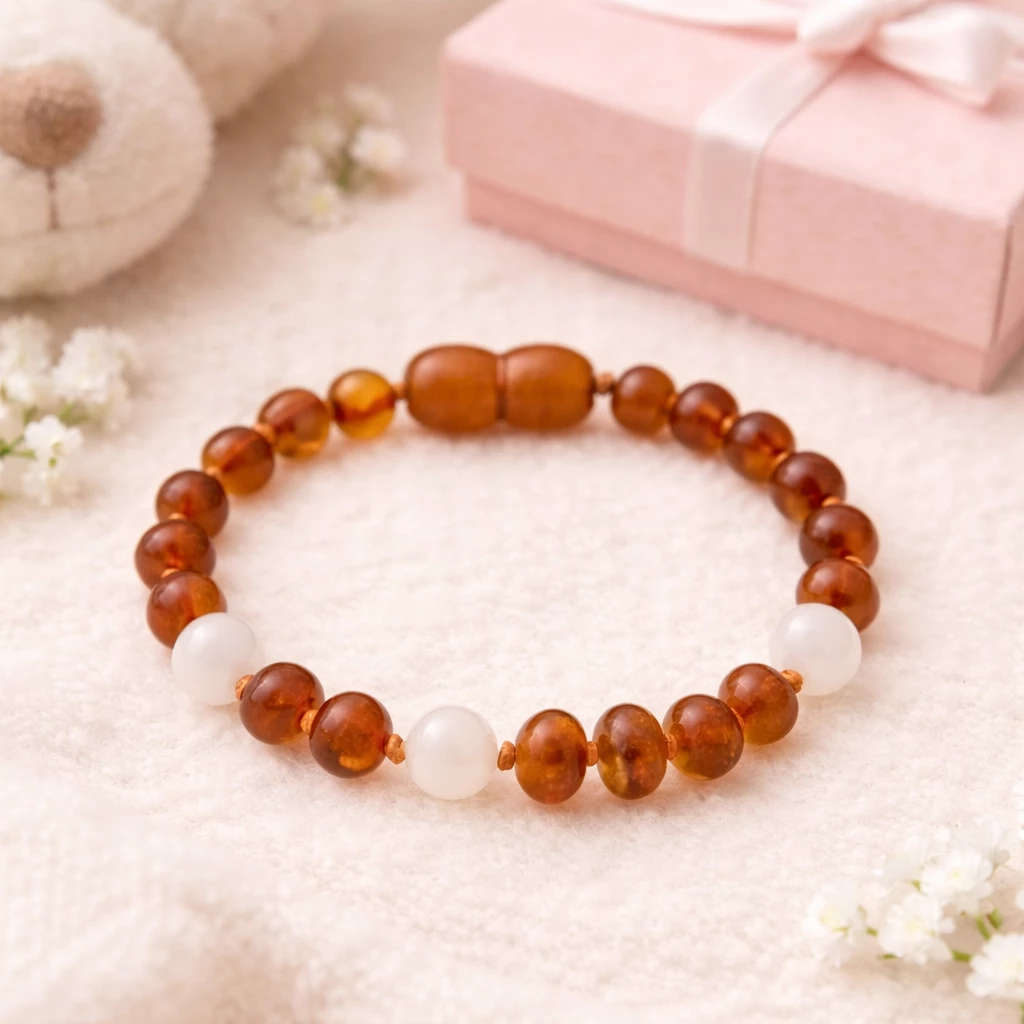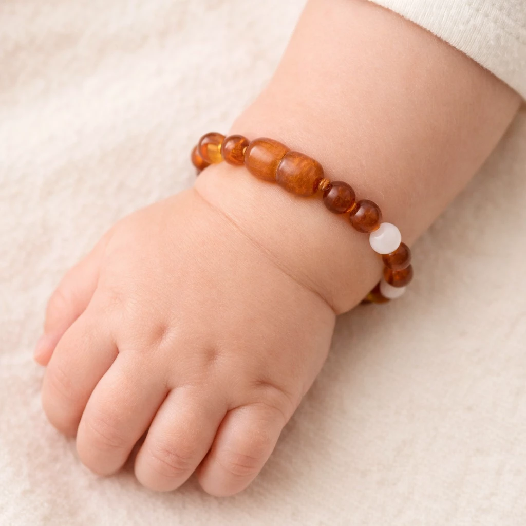 Jantarový náramek s růženínem Cynthia je navržen jako dětský šperk a tvořen přírodními jantarovými korálky doplněnými o růženín, který svým světlým zabarvením vytváří harmonický a přívětivý celek vhodný pro malé nositele.
