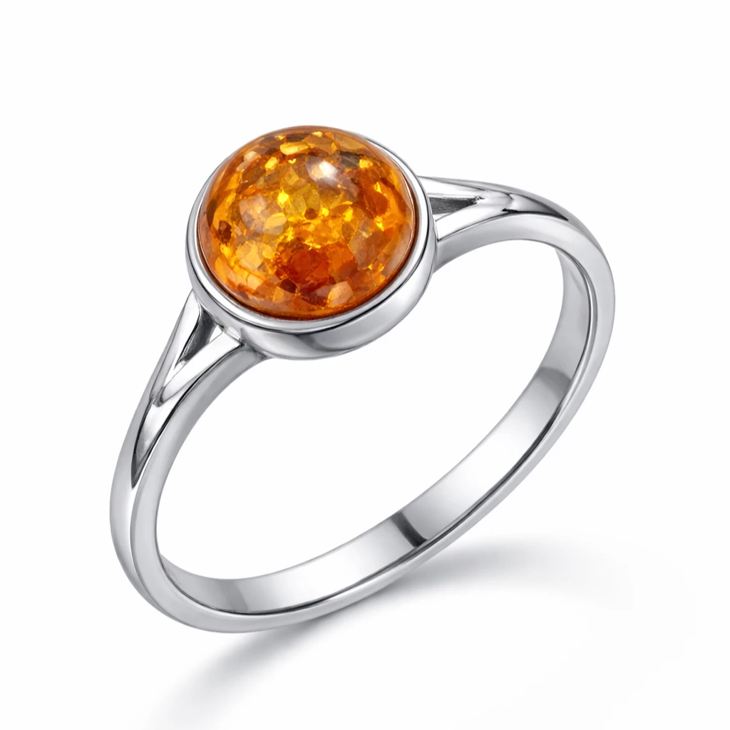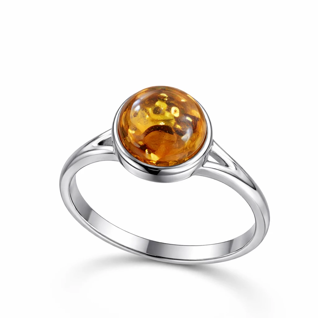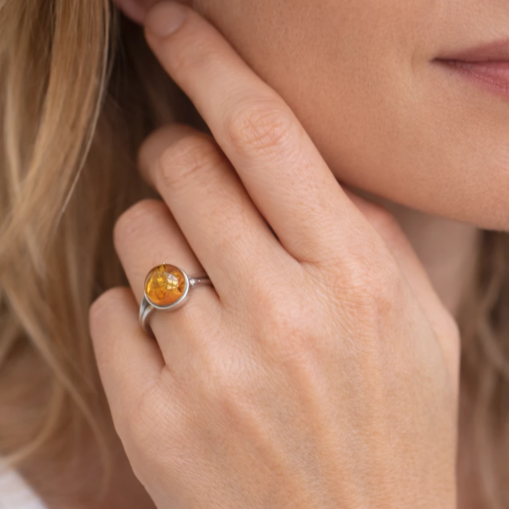 Stříbrný prsten s přírodním jantarem Melia je elegantním šperkem, který v sobě spojuje teplo přírody a nadčasový design.