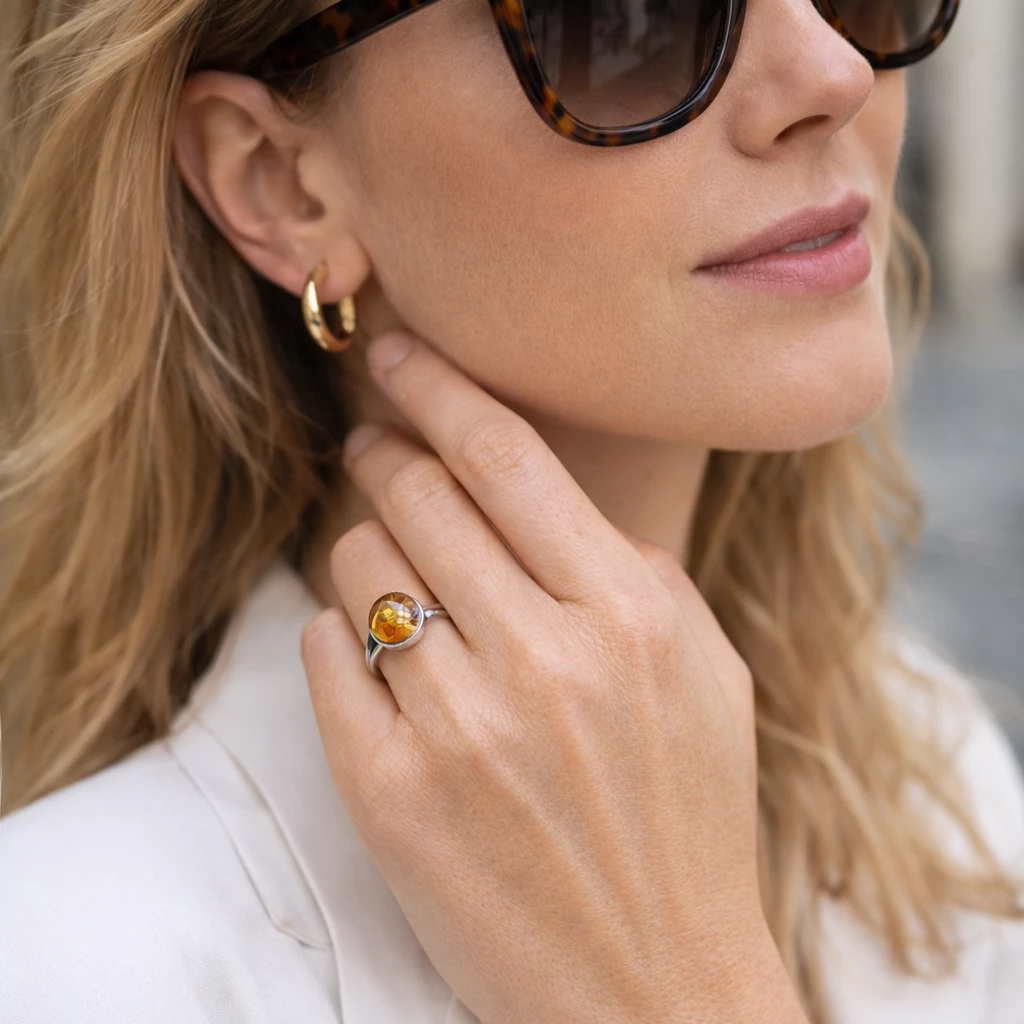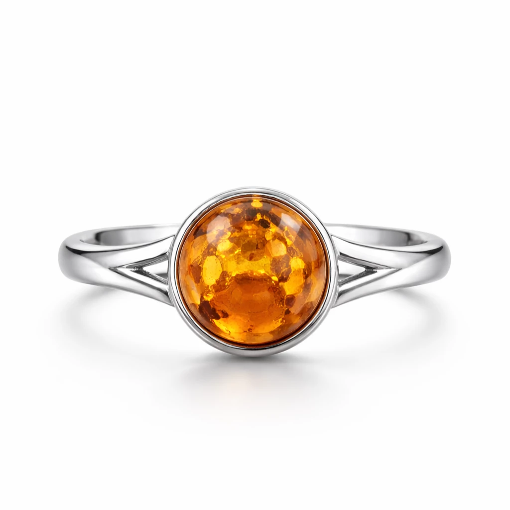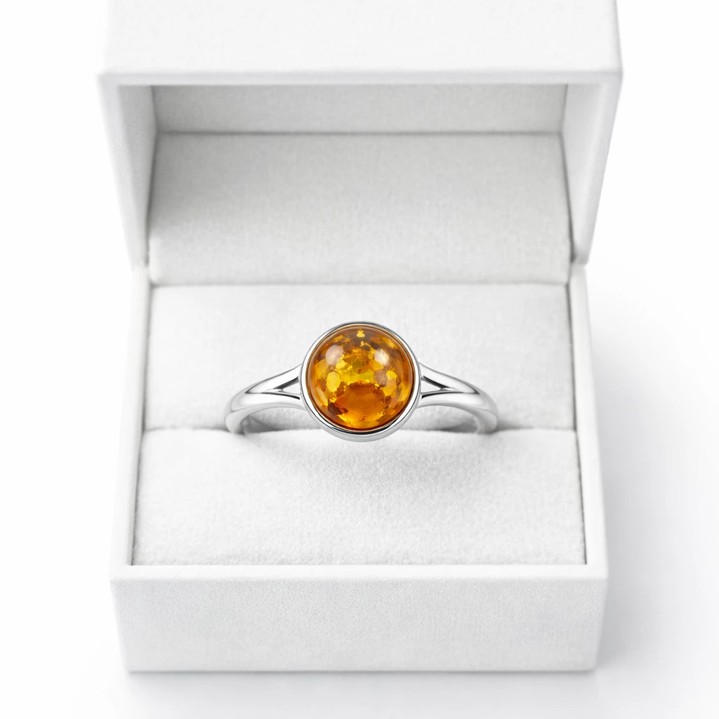 Stříbrný prsten s přírodním jantarem Melia je elegantním šperkem, který v sobě spojuje teplo přírody a nadčasový design.