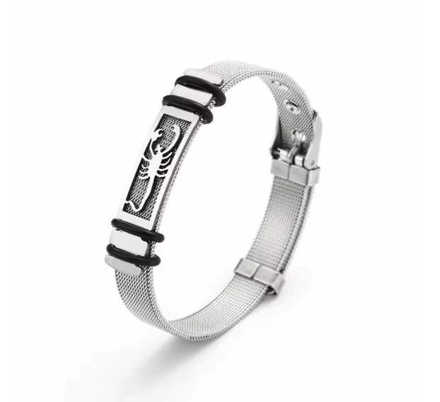 Moderní náramek z chirurgické oceli a motivem štíra. Štír je vyobrazený na destičce. Vhodný je především pro muže, ale slušet bude i ženám. Má bezpečné zapínání.