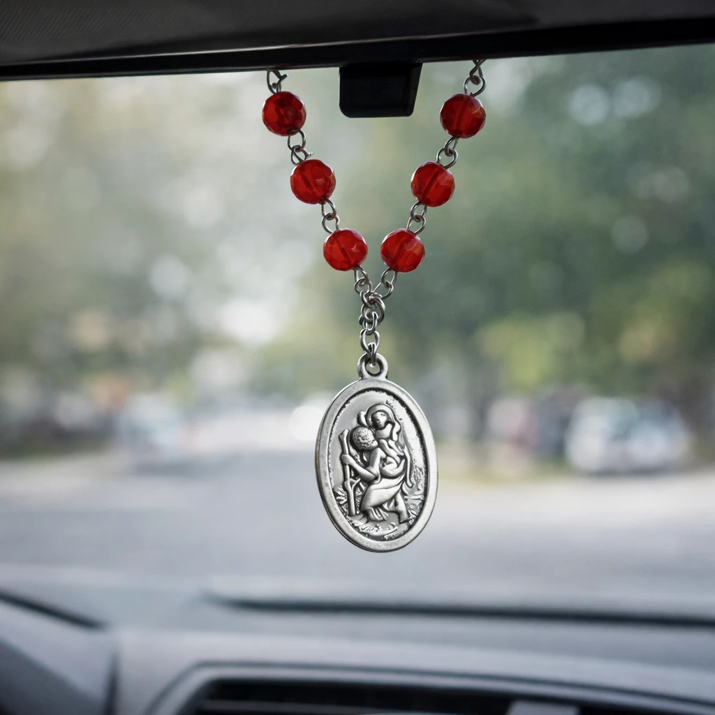 Červený ocelový řetízek s broušenými brazilskými rubíny. Krátký závěs do auta se svatým Kryštofem ochraňuje řidiče a všechny cestovatele. Krátký růženec je obvykle zavěšen za zrcátko u auta, kdy chrání řidiče automobilu při jízdě. Kvalitní zpracování a výroba v České republice zajistí dlouhou životnost tohoto "desátku". Vhodné jako dárek pro všechny cestovatele, řidiče i piloty.