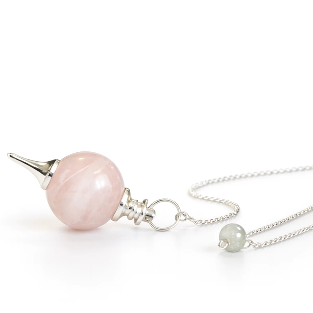 Krásné kyvadlo z růženínu. Kulička z růženínu je zavěšena na bižuterním řetízku a opatřena hrotem, který usnadní práci s kyvadlem.