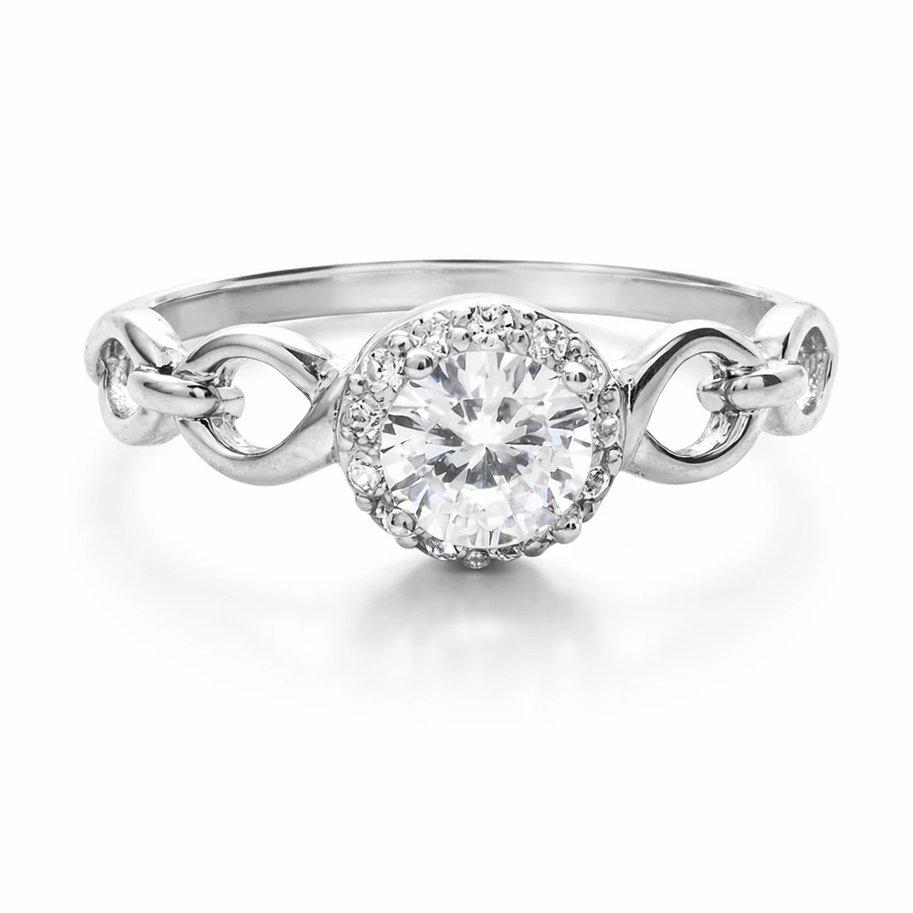 Stříbrný prsten s dominantním čirým zirkonem zasazeným do stříbrného lůžka. Prsten má nádherný brus, který zaručí nepřehlédnutelný třpyt. Po bocích prstenu je stříbro krásně propletené.