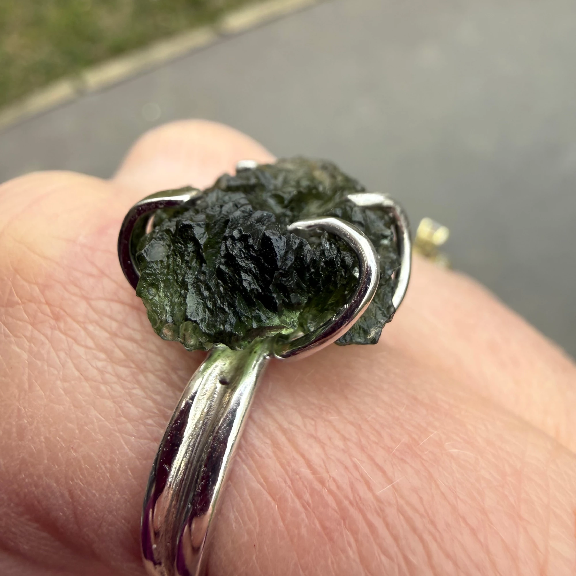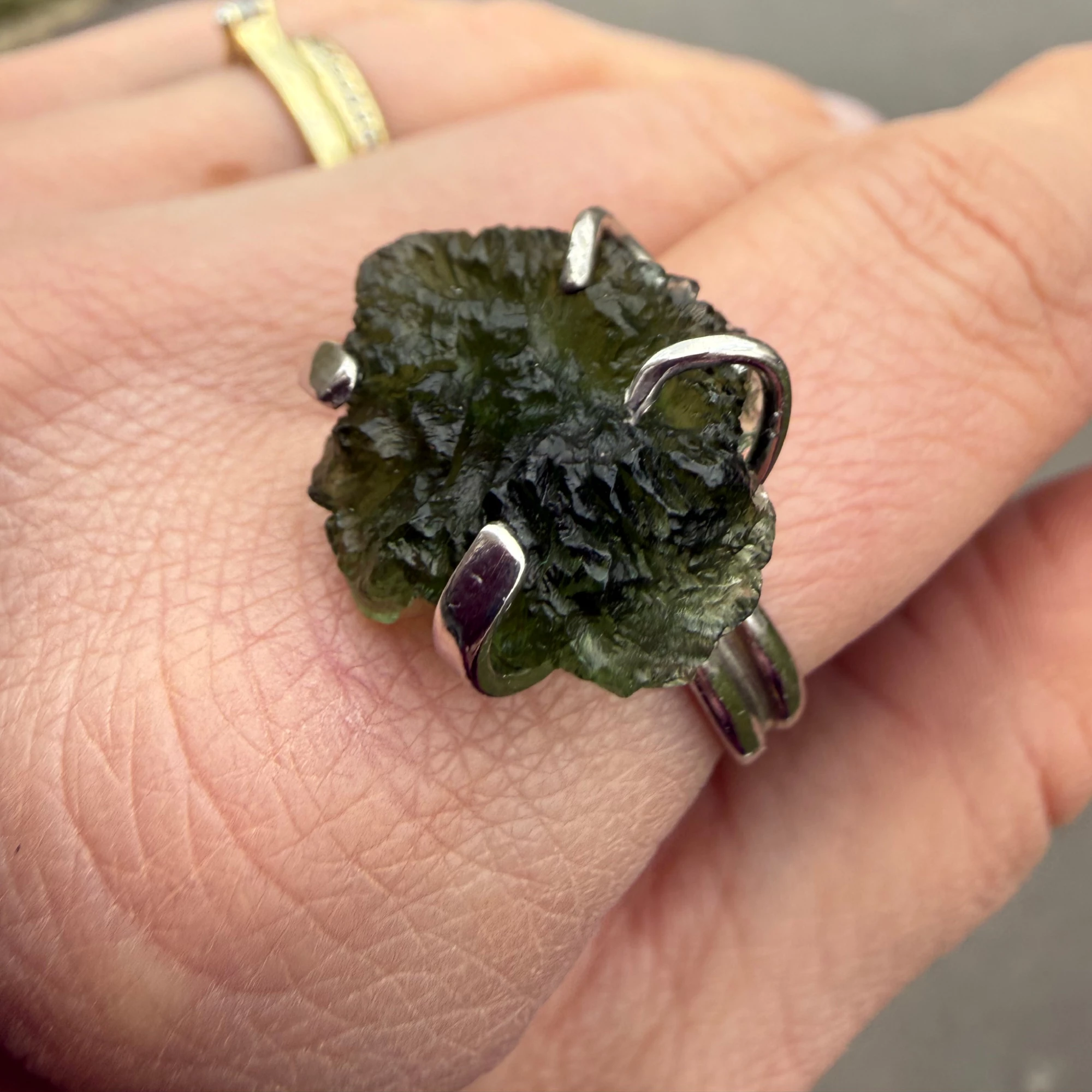 Stříbrný prsten se surovým vltavínem Rawa je vyroben z kvalitního Stříbra Ag 925/1000 a zdoben přírodním vltavínem v jeho surové podobě. Nepravidelný tvar kamene dodává šperku autentický charakter a podtrhuje jeho jedinečnost.