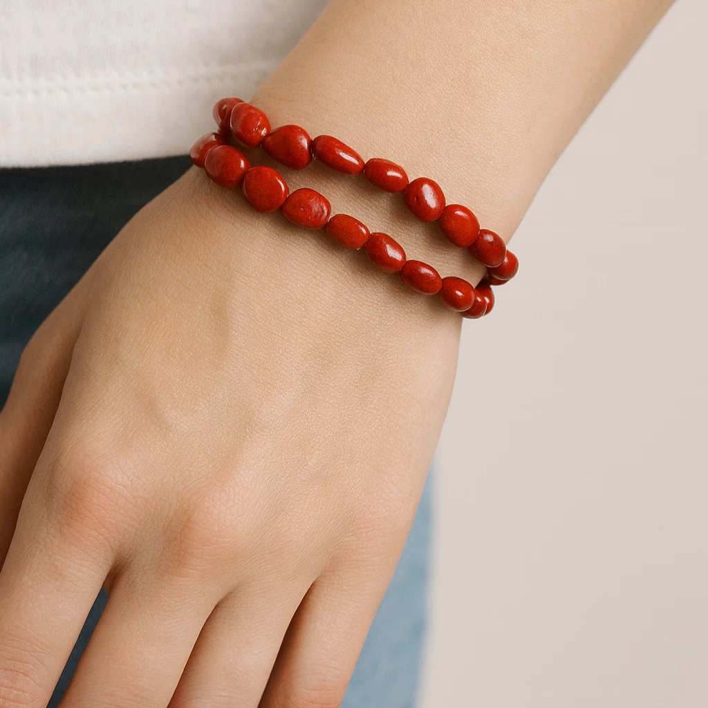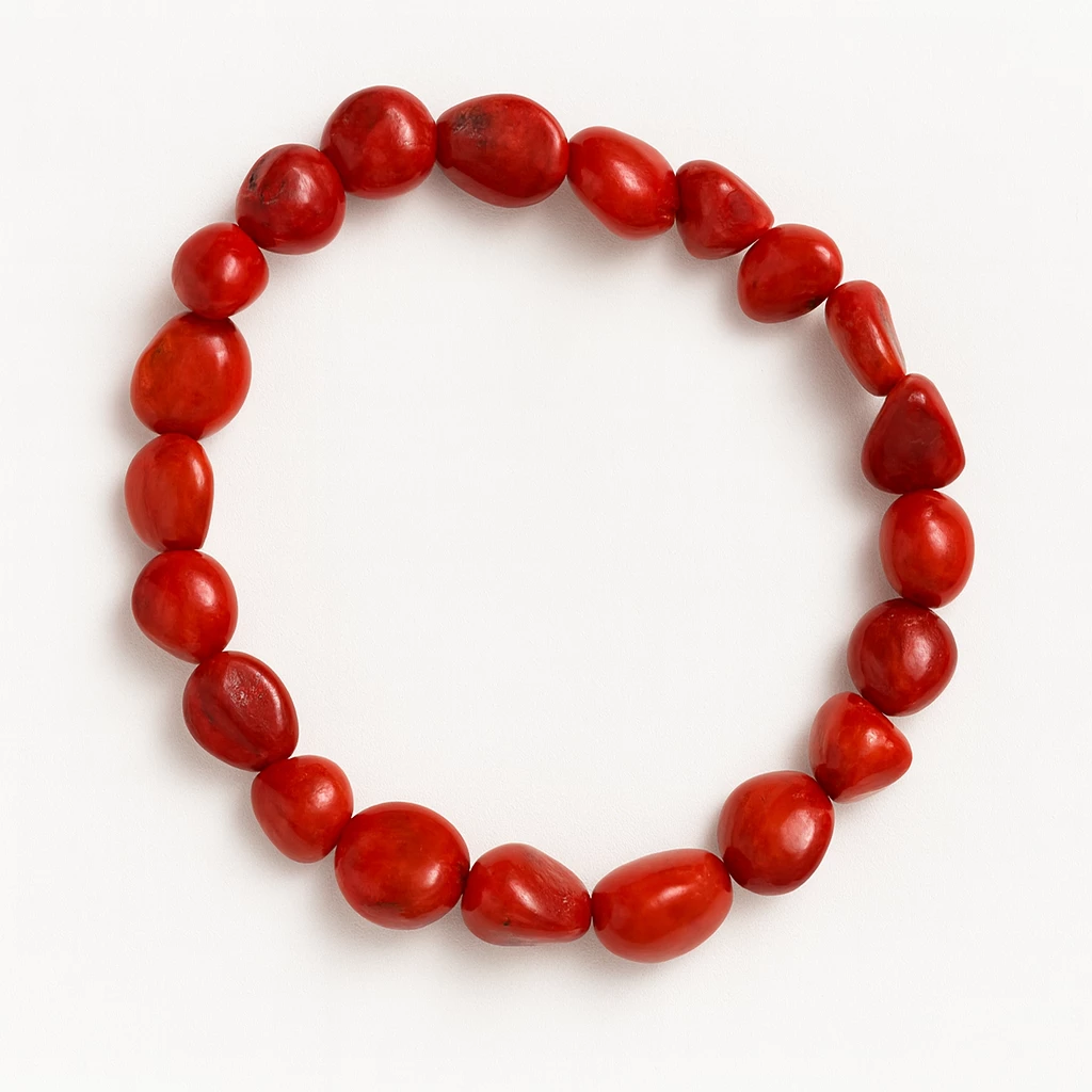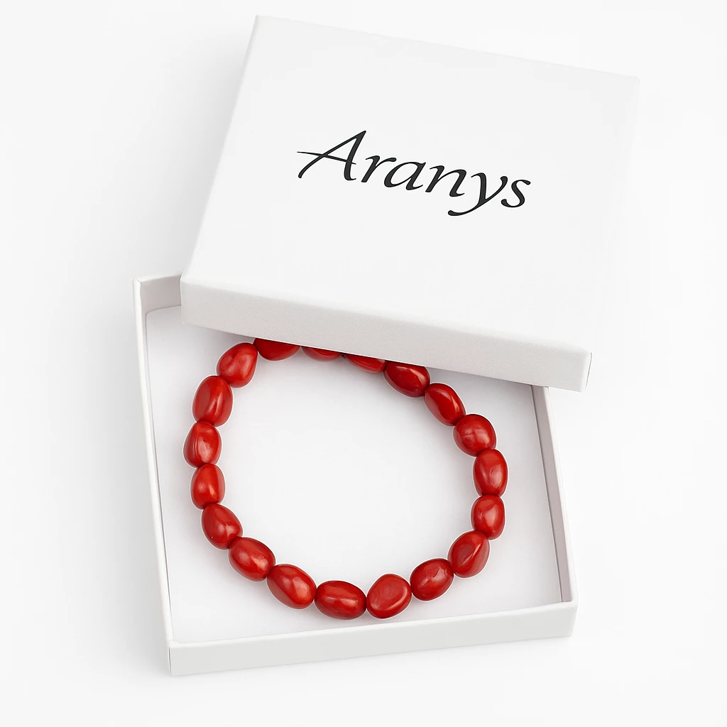 Krásný náramek je tvořený z červených korálů ve tvaru nepravidelných oválků. Jednotlivé korály jsou navlečeny na pružném kvalitním lanku.