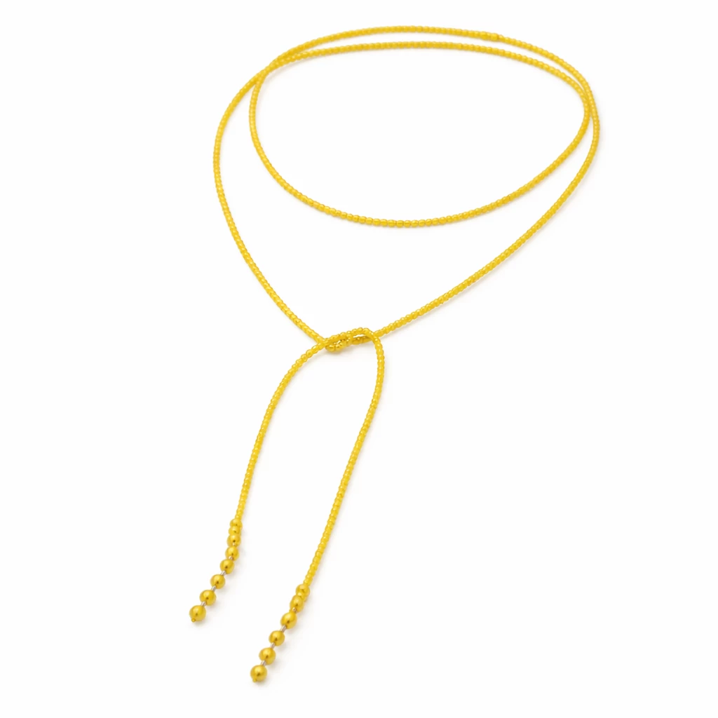 Elegantní a stylový perličkový náhrdelník v lesklé žluté barvě.