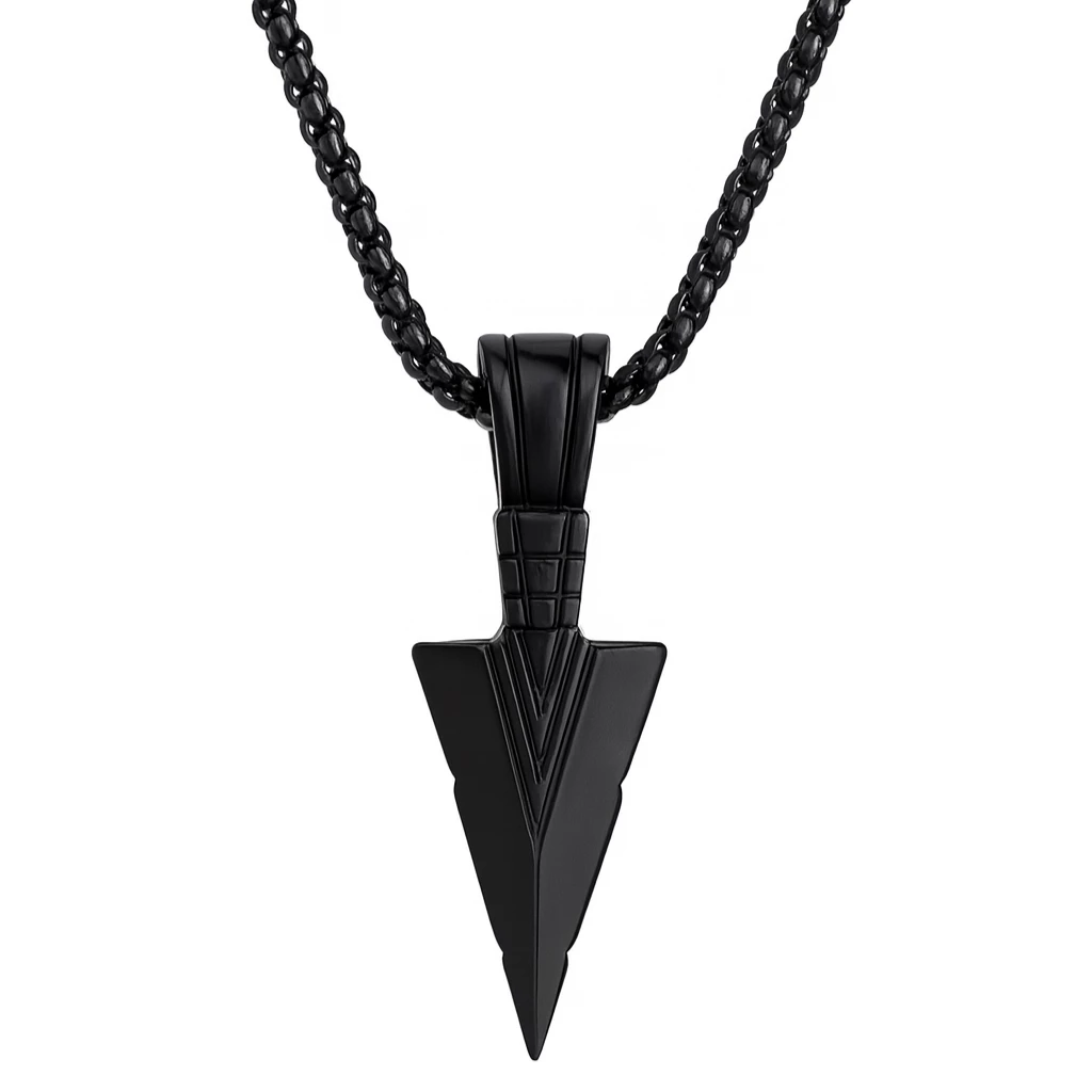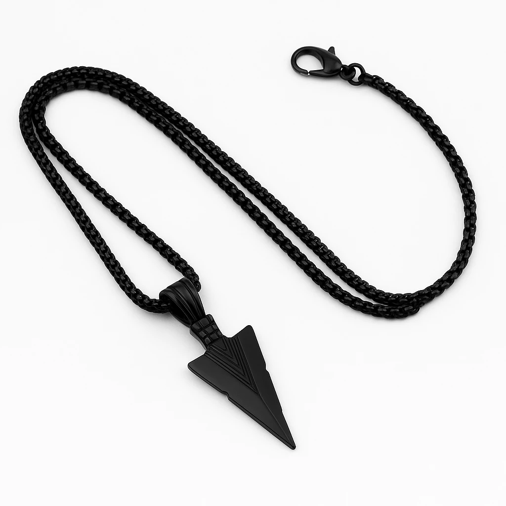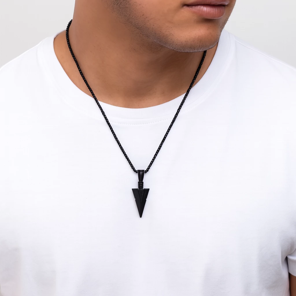 Stylový pánský náhrdelník z černé nerezové oceli s přívěskem ve tvaru šípu. Minimalistický design, který podtrhne mužnost a dodá outfitu výrazný detail.