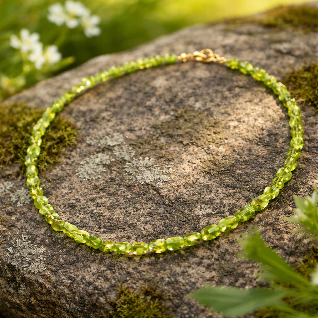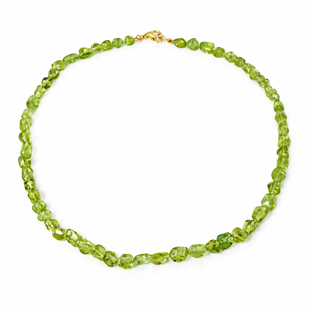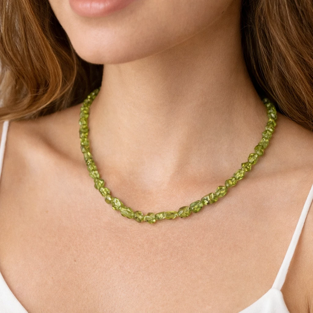 Náhrdelník z olivínu Peridotia je vytvořen z krásných kamenů pravého olivínu, které vynikají svěží zelenou barvou a přirozeným leskem.