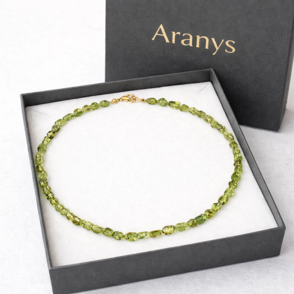 Elegantní náhrdelník Peridotia z pravého olivínu zaujme svou svěží zelenou barvou a přirozenou krásou minerálu. Olivín je oblíbený pro svůj jasný odstín a přírodní energii, která je spojována s harmonií, vitalitou a novými začátky.