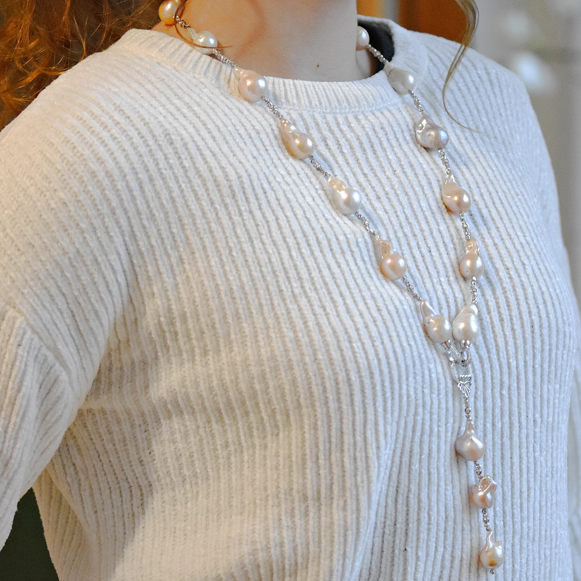 Říční perly v náhrdelníku, který je jedinečný svým zpracováním. Originální náhrdelník v bílo růžové barvě.