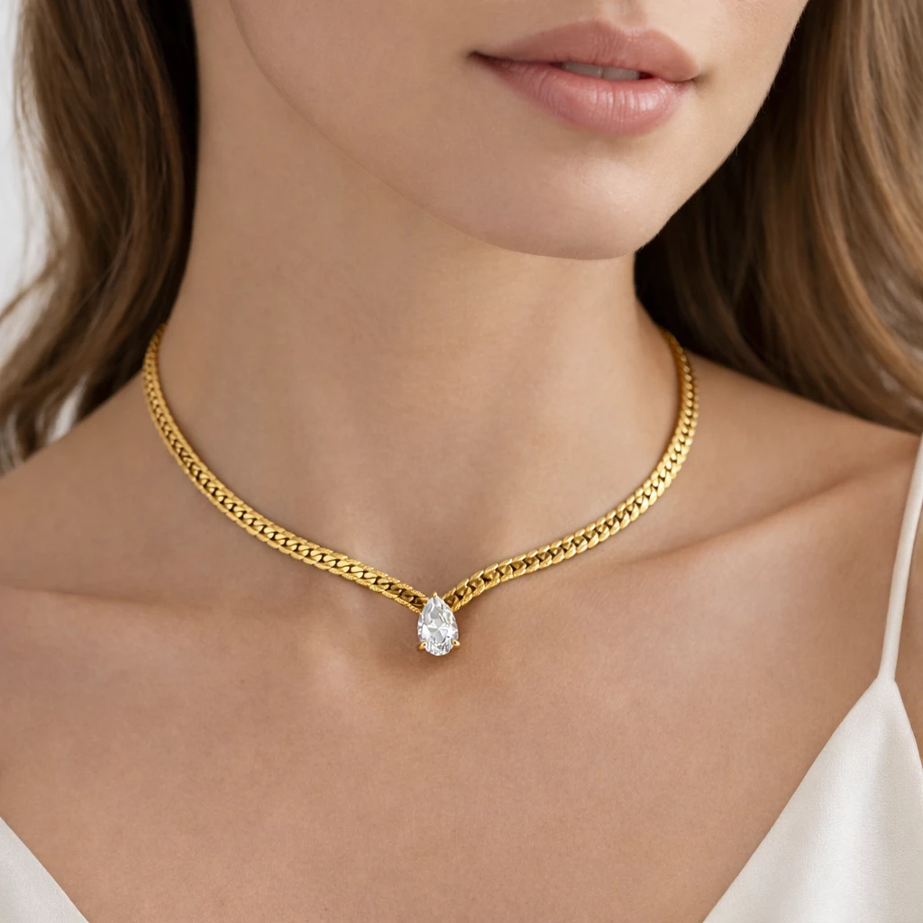 Dominantou je precizně broušený zirkon, který zachytává světlo z každého úhlu a vytváří efektní lesk podobný diamantovému. Ocelové provedení je odolné, šperk se skvěle hodí samostatně i do vrstvení s dalšími řetízky.