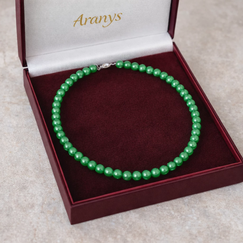 Dámské korále v půvabném zeleném odlesku se budou krásně výjimat na Vašem krku. Využijete při každodenních událostech i slavnostních příležitostech. Jsou navlečeny na pevném lanku a zapínání mají na ocelovou karabinku.