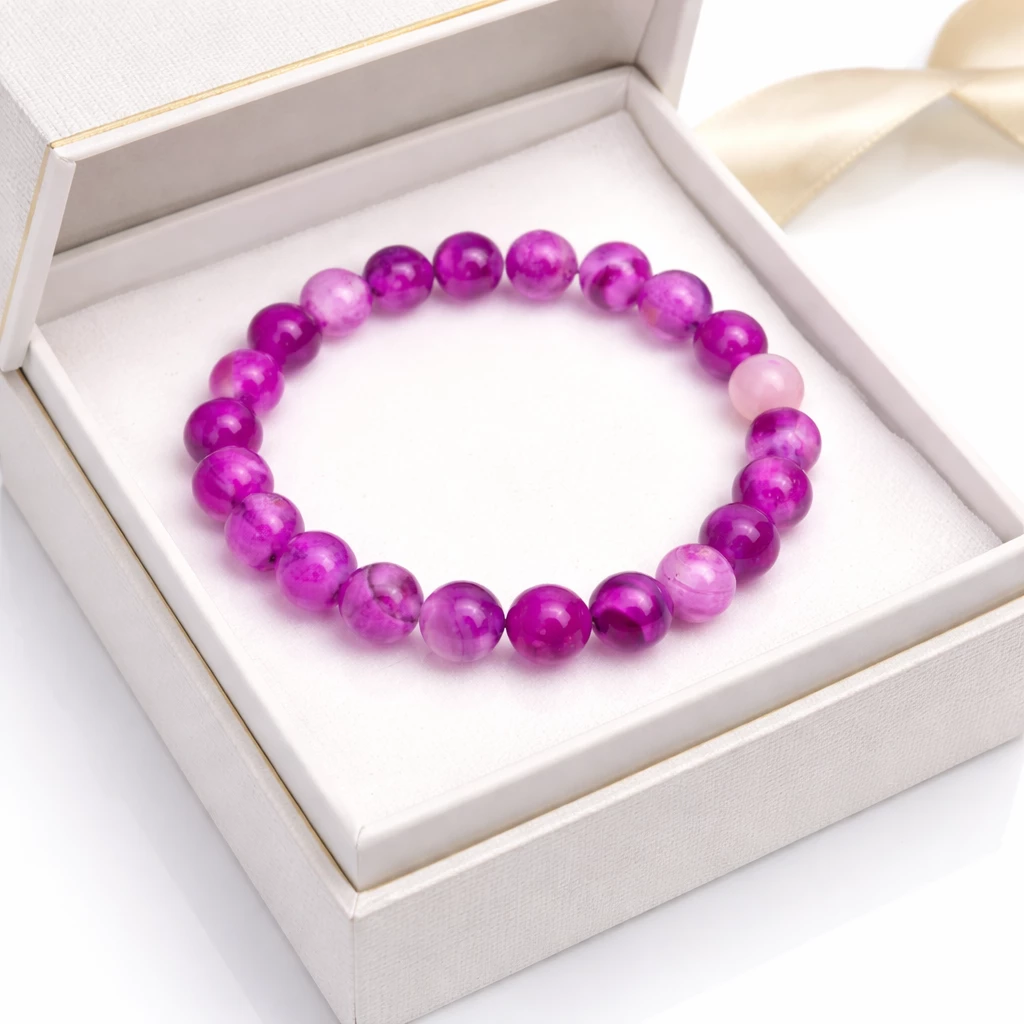 Náramek kuličkový achát Jistota zaujme svou barevnou rozmanitostí a přirozenou kresbou, která dodává každému kusu jedinečný charakter. Achát je tradičně spojován se stabilitou, rovnováhou a ochranou, a proto je tento náramek nejen stylovým doplňkem, ale i symbolem vnitřní jistoty a klidu.
