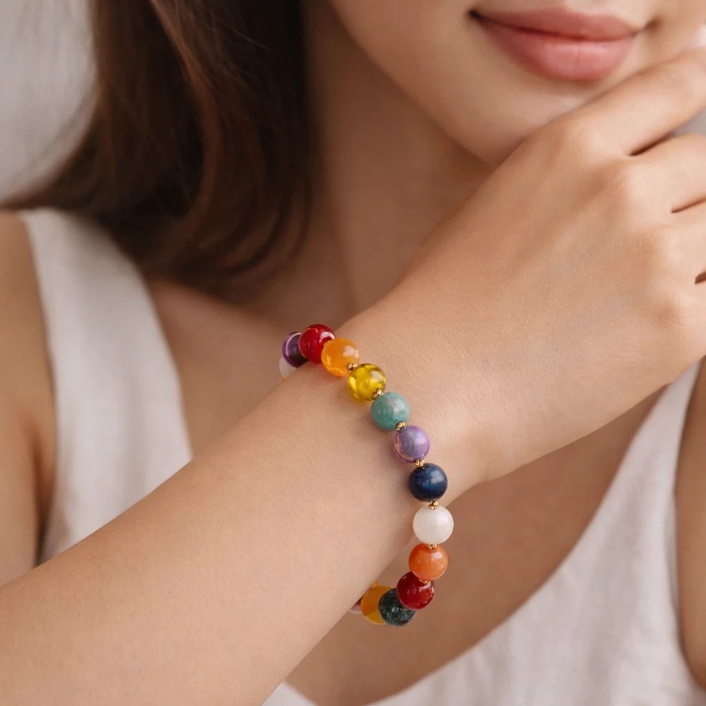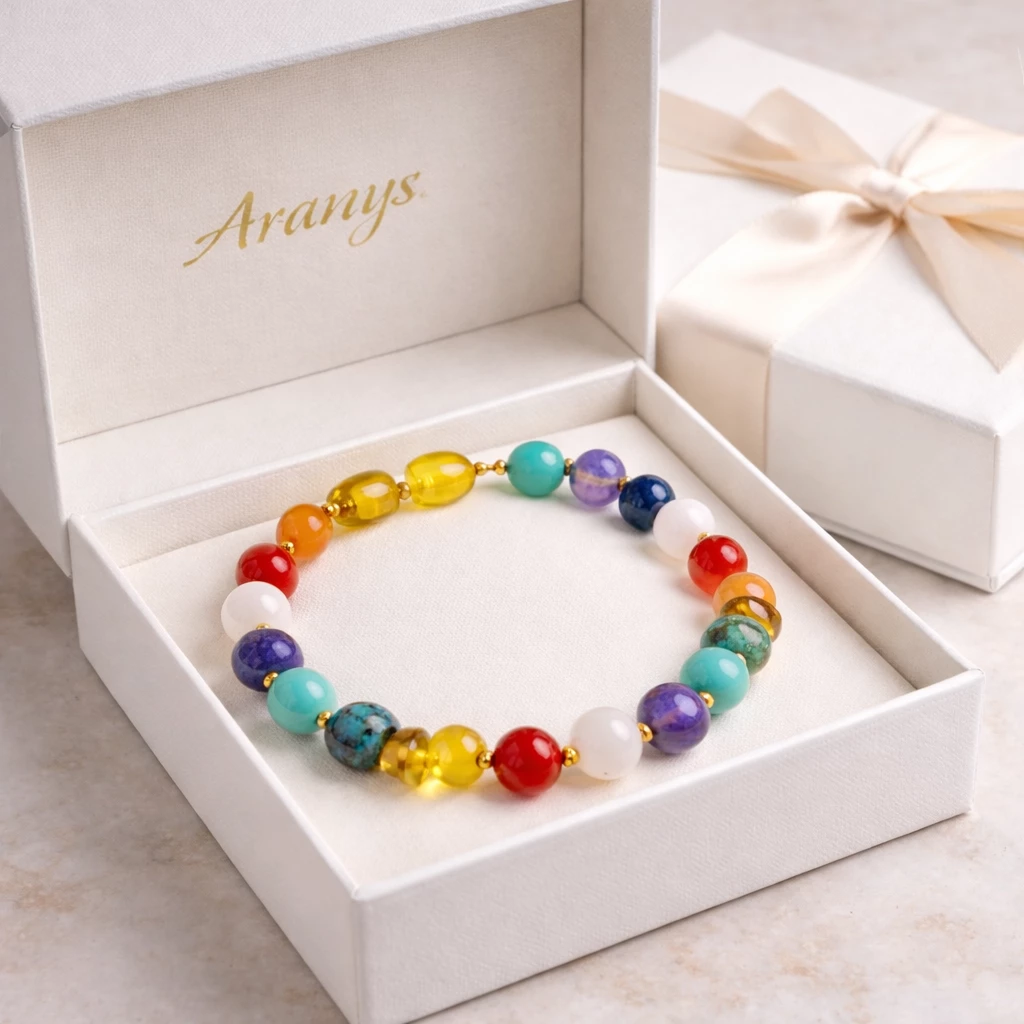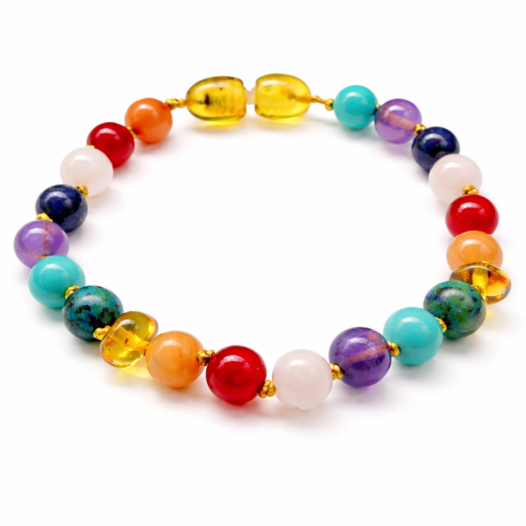 Náramek z jantaru a čakrových kamenů Harmony spojuje krásu přírodních minerálů s jemnou energií jantaru. Pestrá kombinace kamenů symbolizuje harmonii a rovnováhu, díky čemuž je tento šperk nejen krásným doplňkem, ale také talismanem pozitivní energie.