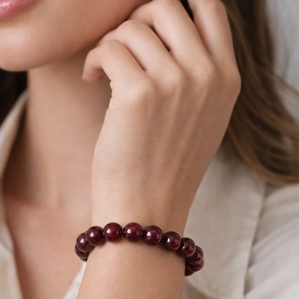 Náramek z přírodního granátu v nadčasovém kuličkovém provedení je elegantní doplněk, který se hodí na každý den i k formálnějšímu outfitu. Granát je oblíbený pro svou hlubokou vínově červenou barvu a působí výrazně, ale stále vkusně – skvěle vynikne samostatně i v kombinaci s dalšími náramky.