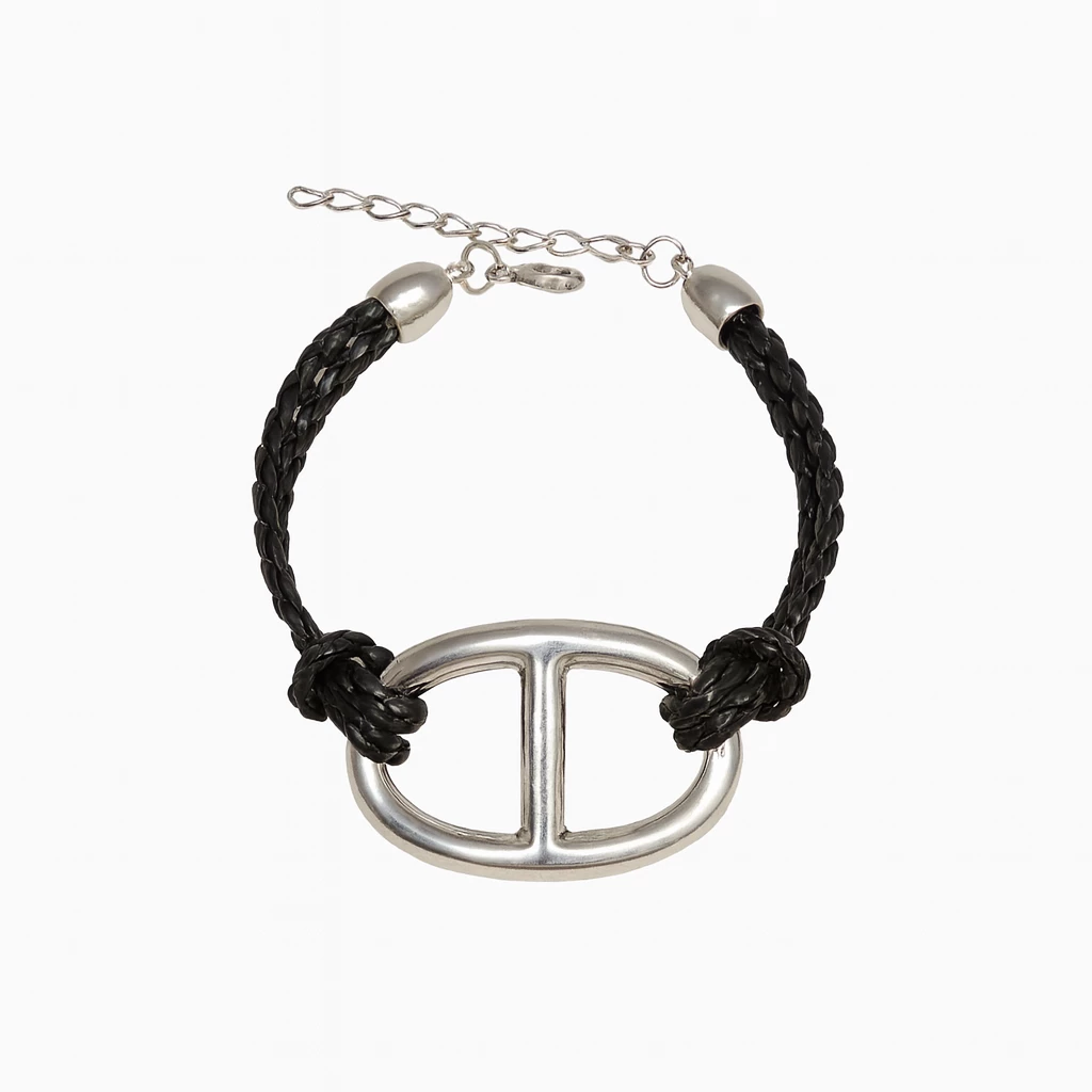 Ozdobte své zápěstí tímto pevným náramkem ve tvaru spony, který je připevněný na voskované šnůrce s prodlužužujícím řetízkem. Zapínání náramku ja na klasickou karabinku. Jako doplněk jej můžete zvolit ke každému stylu oblečení.