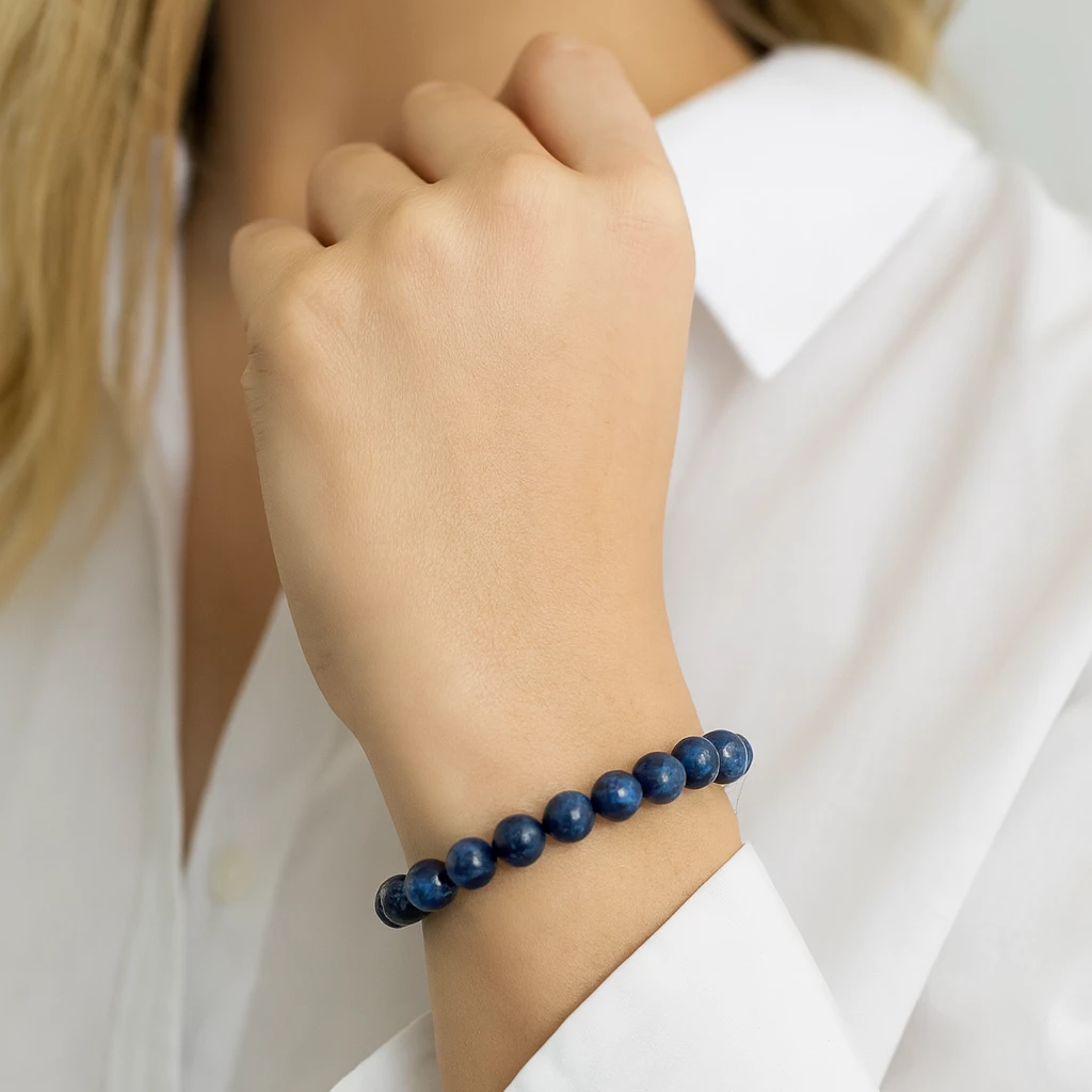 Uhrančivě modrý kuličkový náramek s minerálem kyanit (disten), který má nejen nádhernou barvu, ale také pozitivní účinky.