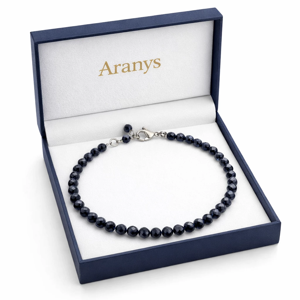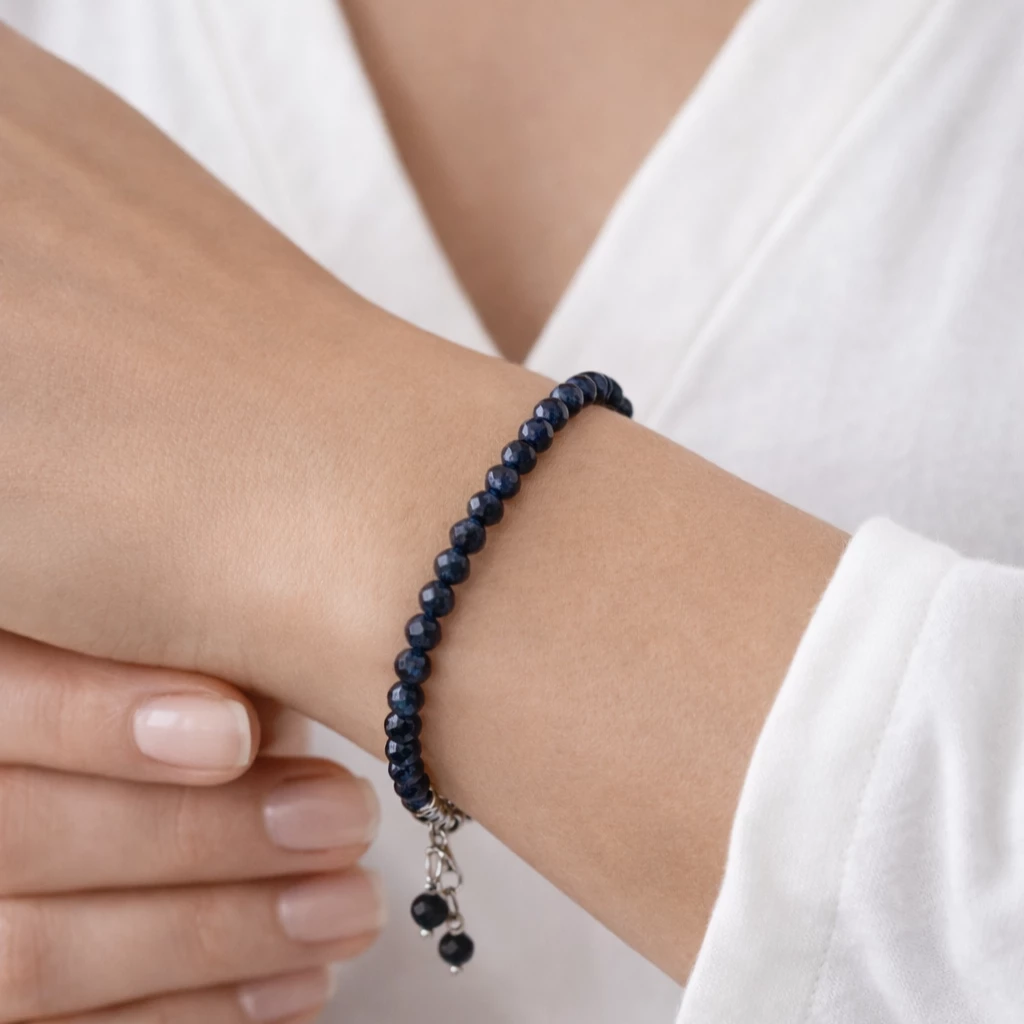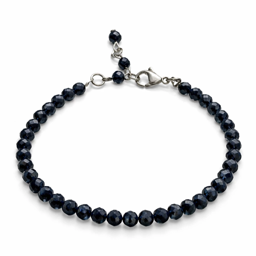 Safír je minerál spojovaný s moudrostí, klidem a vnitřní rovnováhou. Jemně broušené korálky nechávají vyniknout přirozenou krásu kamene a vytvářejí sofistikovaný detail, který podtrhne každý outfit.