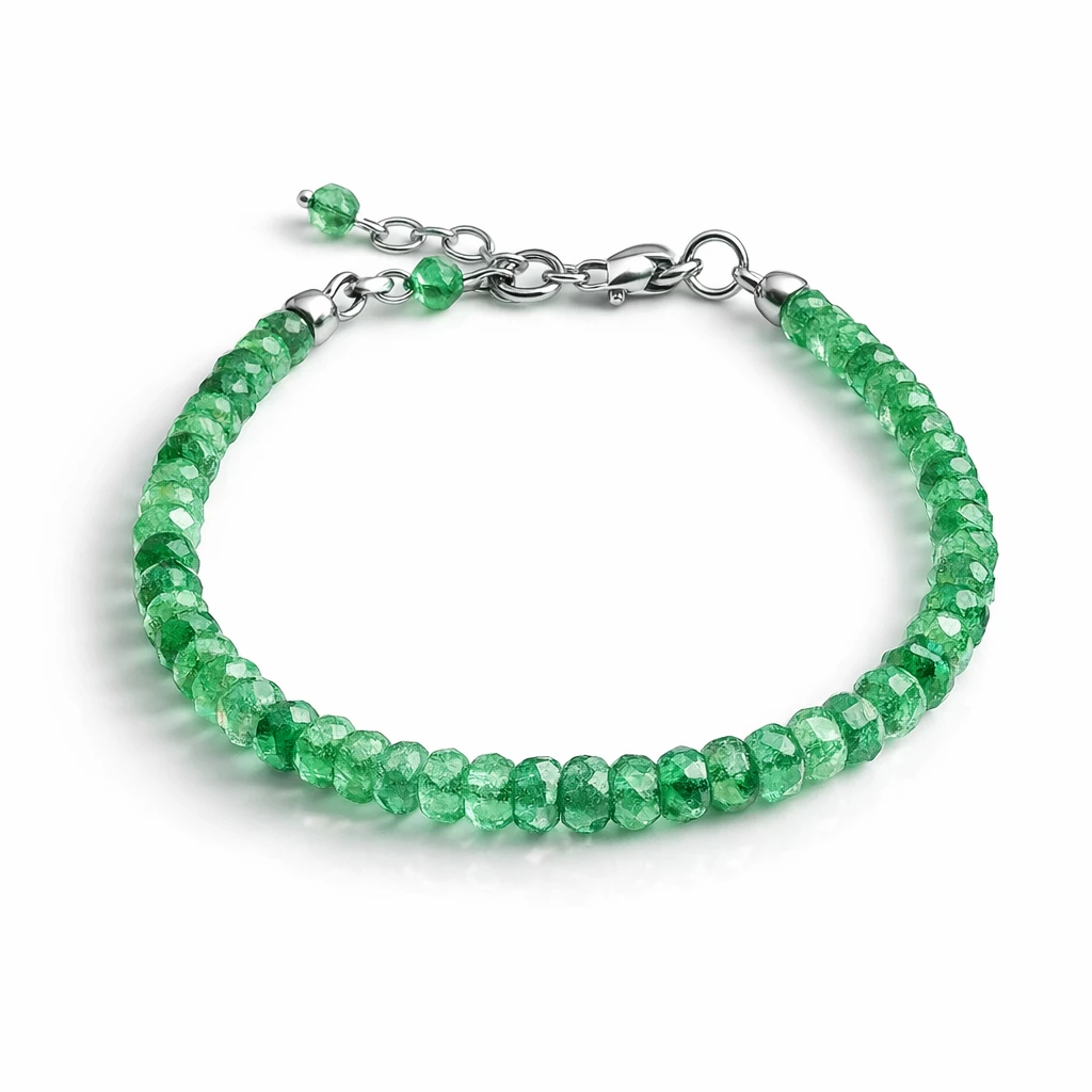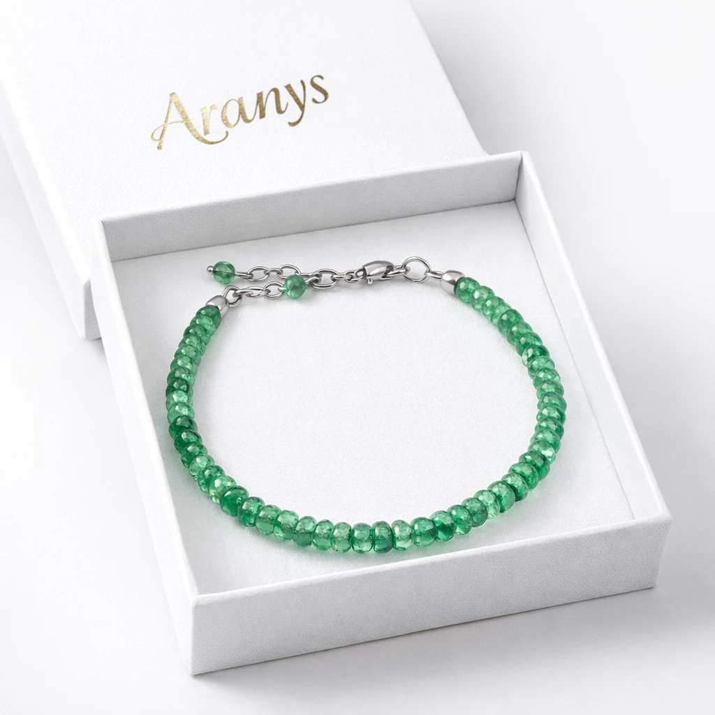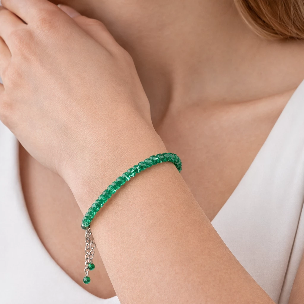 Jedinečný a elegantní náramek z broušeného smaragdu oslní nejen krásnou barvou, ale také půvabným vzhledem. Jemný náramek se velmi příjemně nosí a jeho konečnou délku si můžete sama zvolit díky prodlužovacímu řetízku.