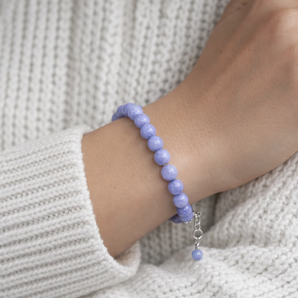 Nádherný náramek z kuliček syntetického tanzanitu v tajemné modrofialové barvě je luxusním kouskem do Vaší šperkovnice.