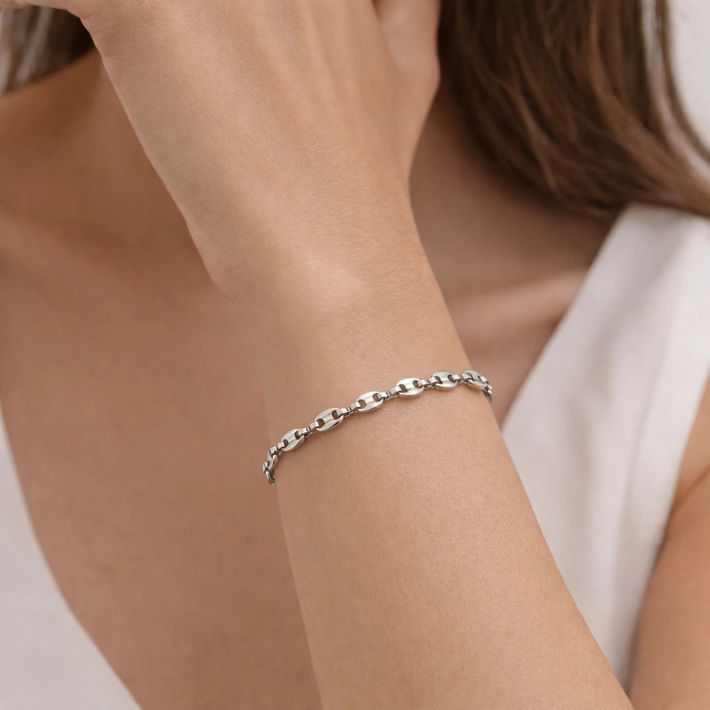 Nadčasový ocelový náramek s elegantním článkovým designem, který skvěle doplní každý outfit. Vyroben z kvalitní chirurgické oceli, odolný, lesklý a pohodlný pro každodenní nošení. Ideální pro ženy i muže, kteří milují čistý a moderní styl.