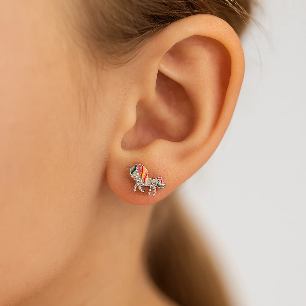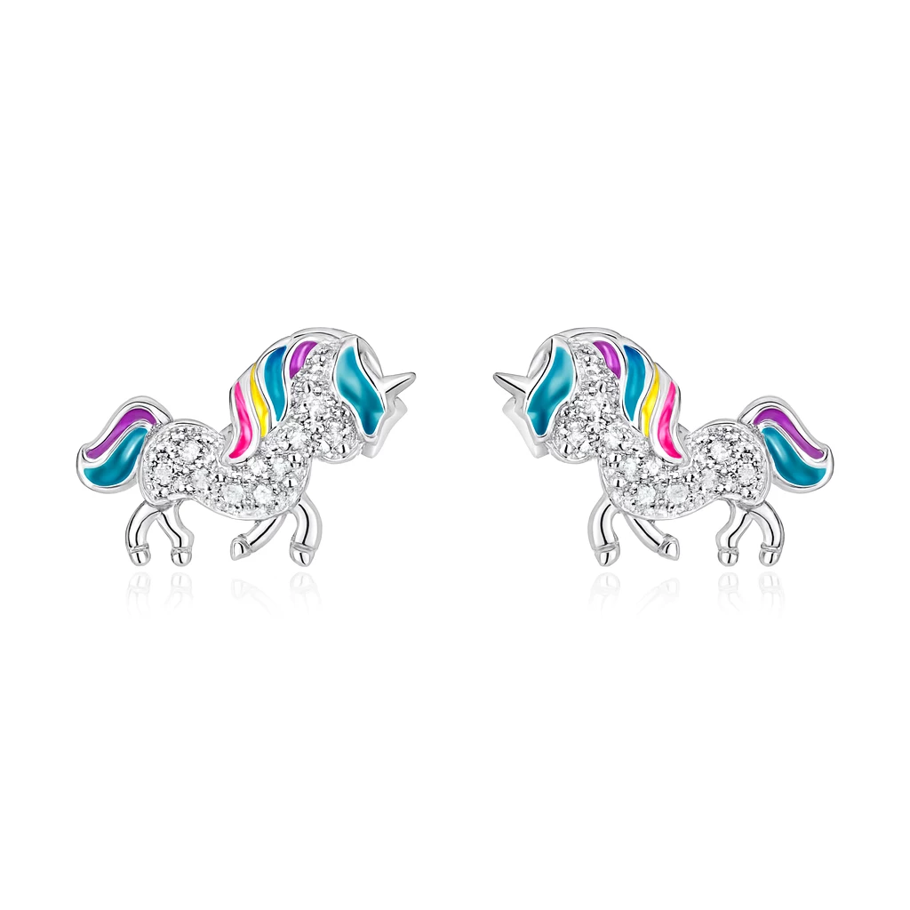 Jemné dětské stříbrné náušnice jednorožec se smaltem. Decentní šperk, který velmi jednoduše sladíte s dalšími šperky.