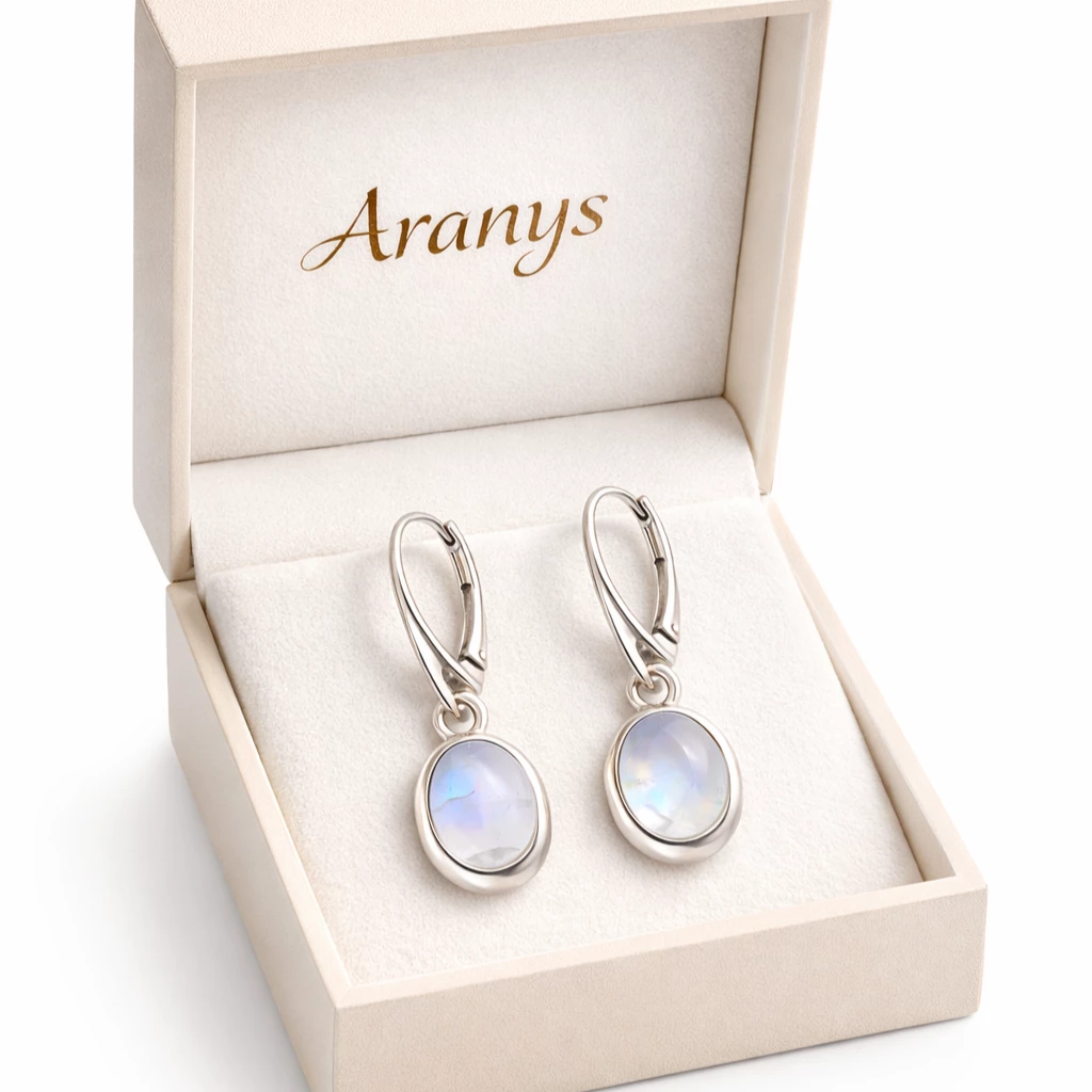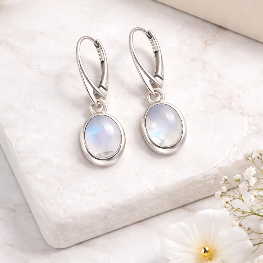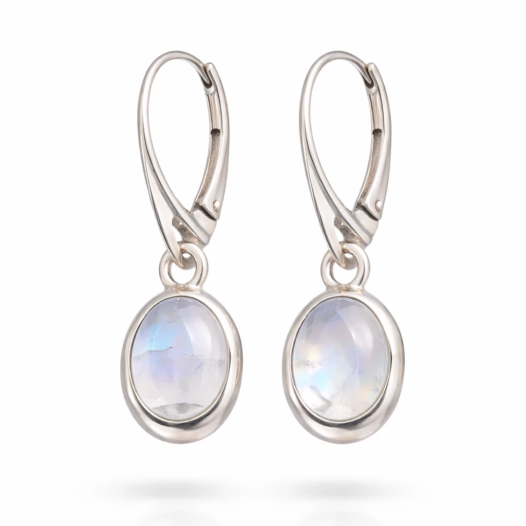 Půvabné visací dámské náušnice oválného tvaru, v jejichž stříbrném lůžku je pečlivě usazený měsíční kámen.