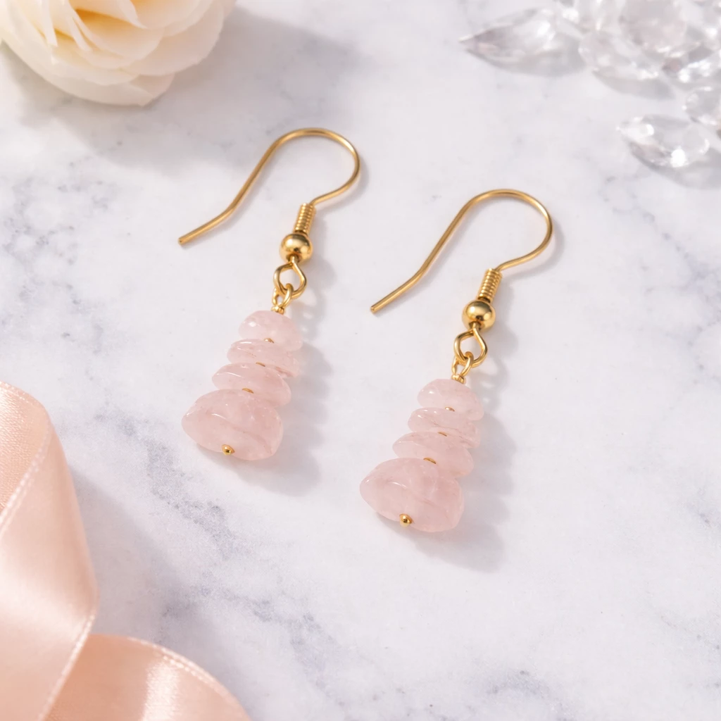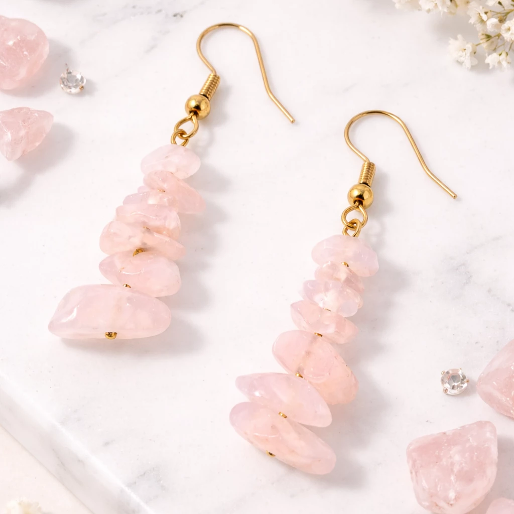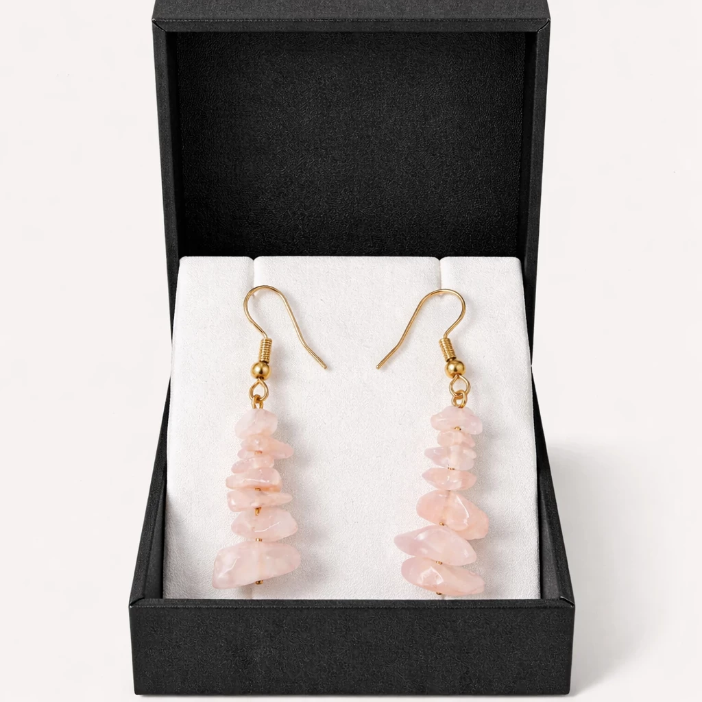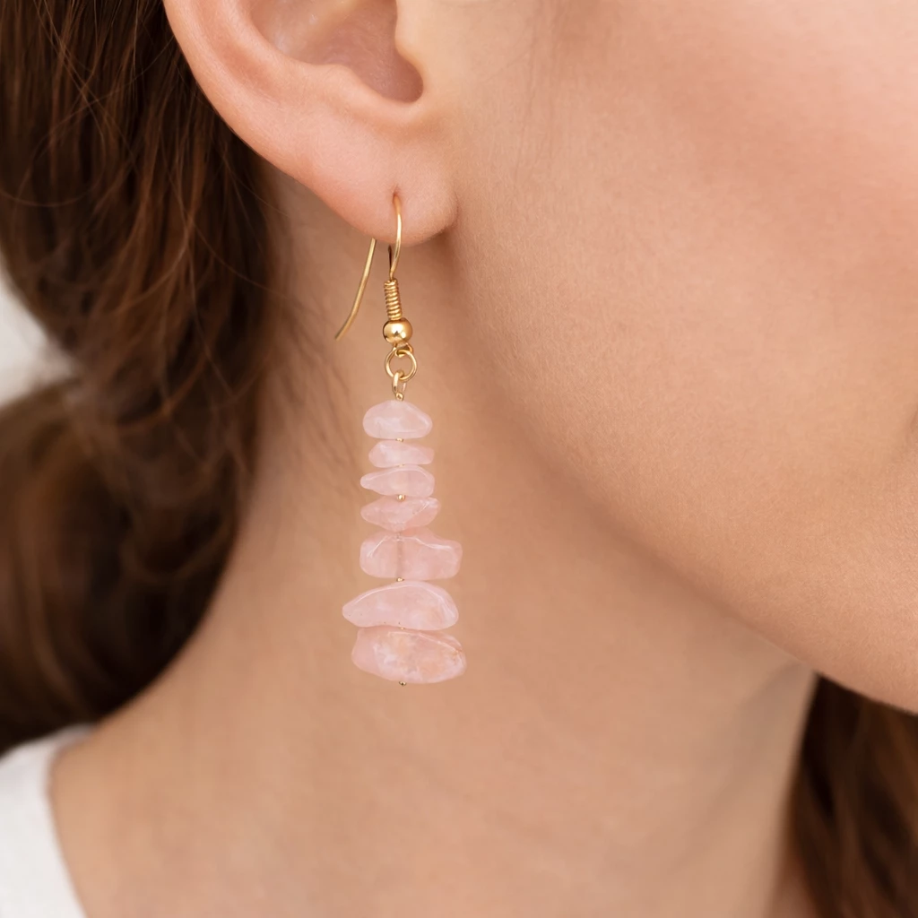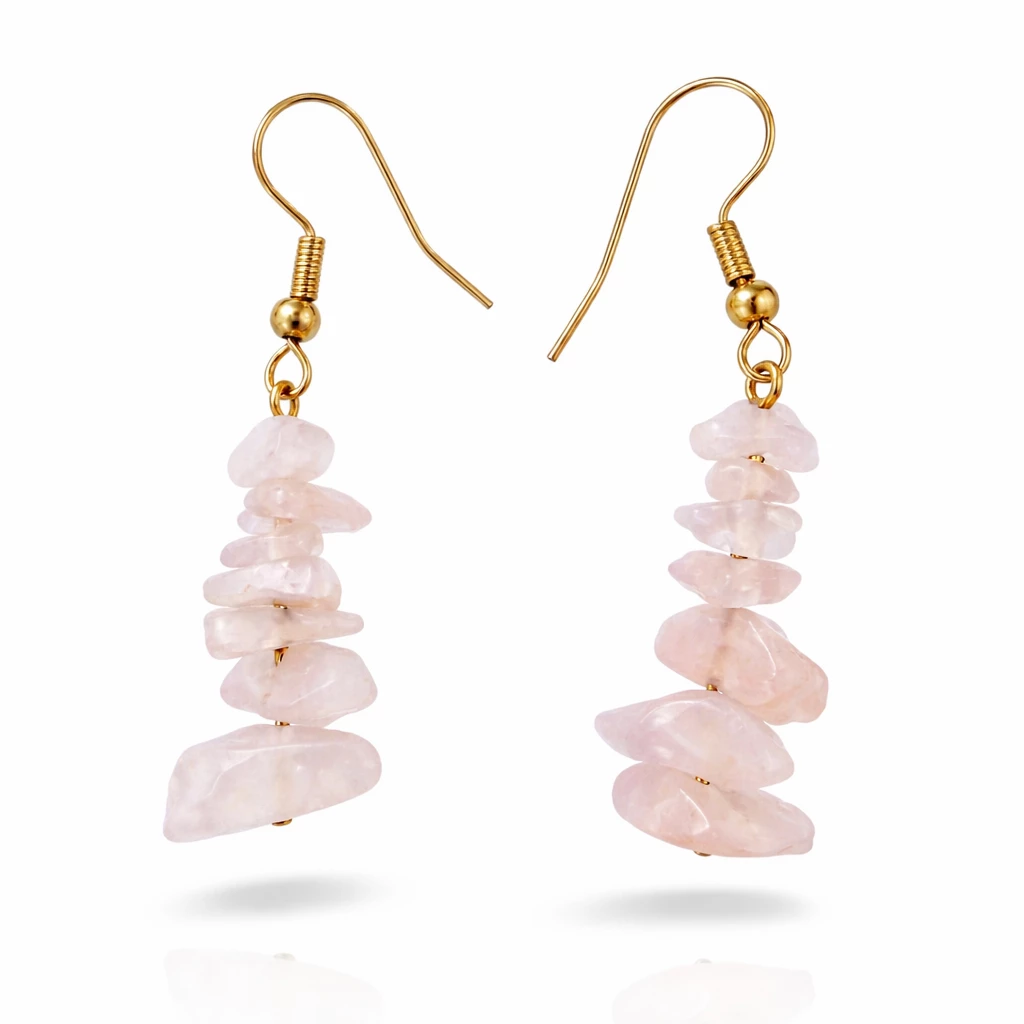 Visací náušnice Auriele okouzlí svou jemnou růžovou barvou růženínu, která je symbolem lásky, harmonie a něžnosti. Nepravidelně tvarované kamínky vytvářejí přirozený a originální vzhled, zatímco zlacené komponenty dodávají šperku elegantní nádech.