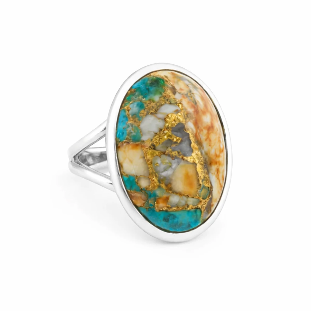 Dokonalý jaspis, pyrit a tyrkys usazený v oválném stříbrném lůžku. Ochranné kameny plné pozitivních a žádaných vlastností.