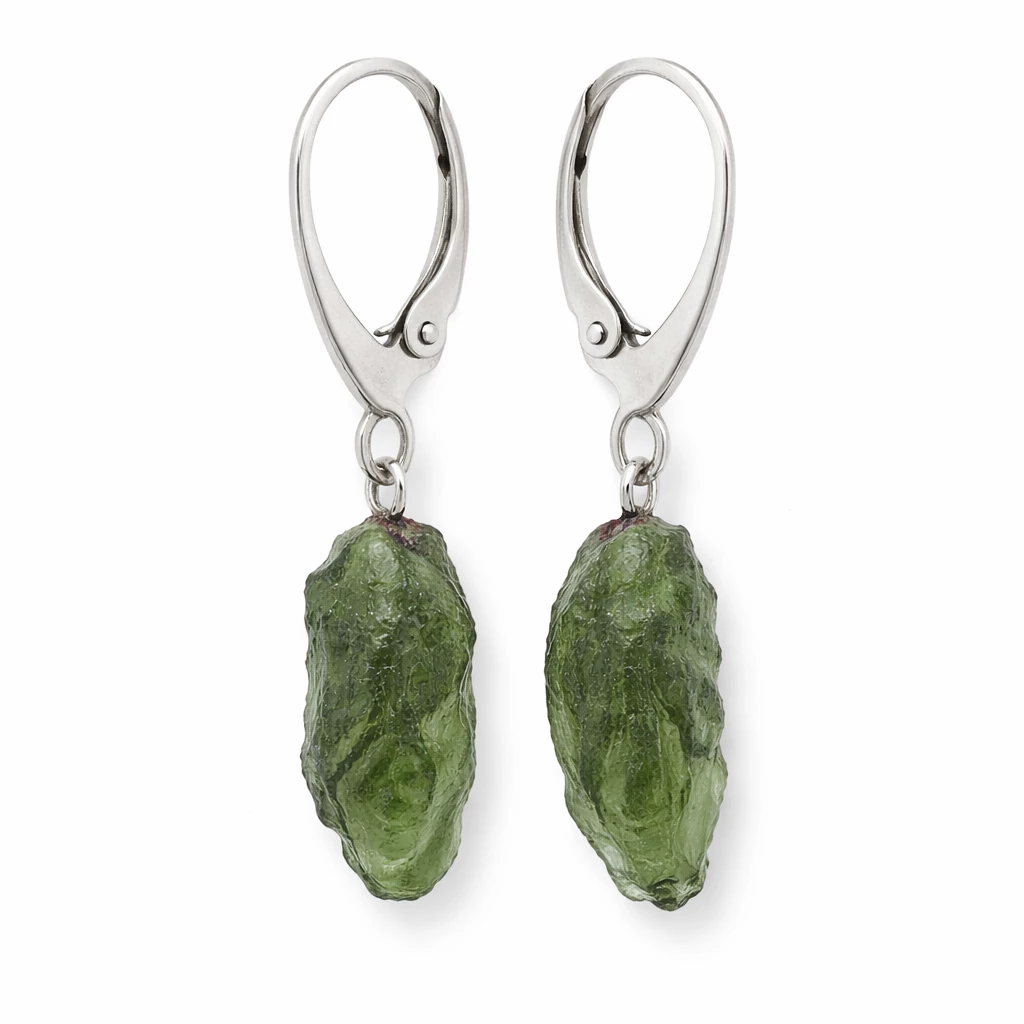Stříbrné náušnice se surovým vltavínem z kolekce Velra vynikají autentickým vzhledem a přirozenou elegancí.