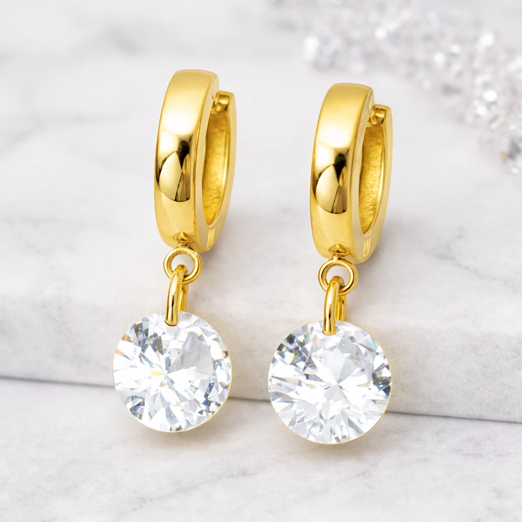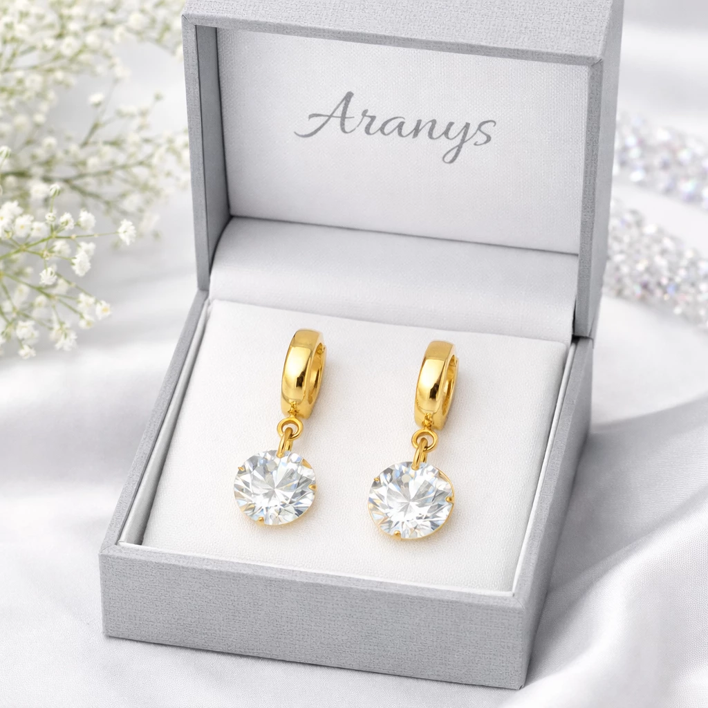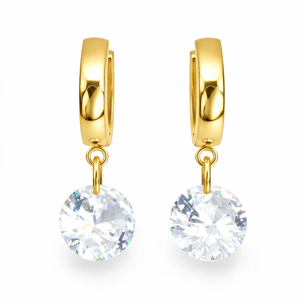 Náušnice jsou vyrobeny z chirurgické oceli, která je oblíbená pro svou odolnost, stálost barvy a komfort při nošení. Klasický kruhový tvar doplněný závěsným kamenem působí velmi elegantně a nadčasově.