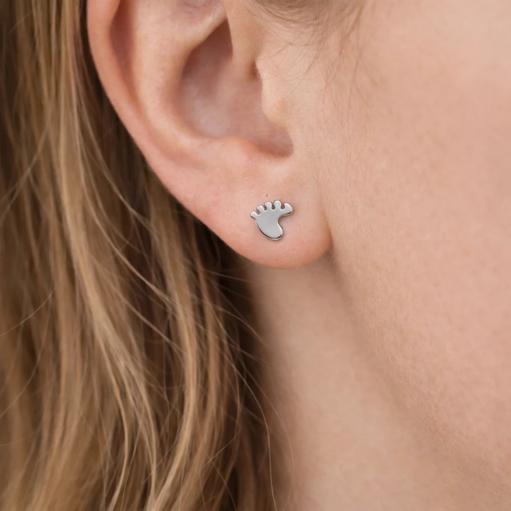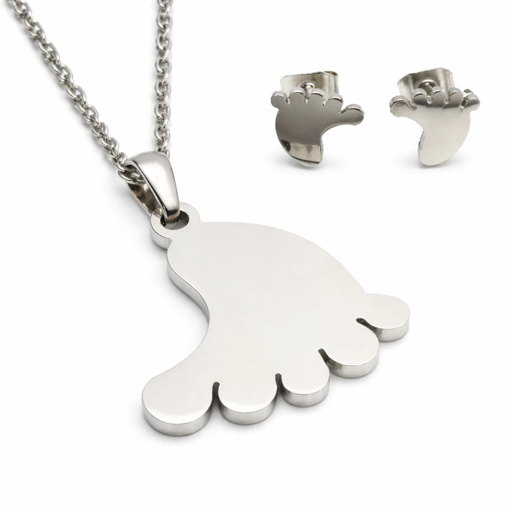 Ocelová souprava s nožičkou Amori z chirurgické oceli obsahuje náušnice a přívěsek s řetízkem v motivu dětské nožičky.